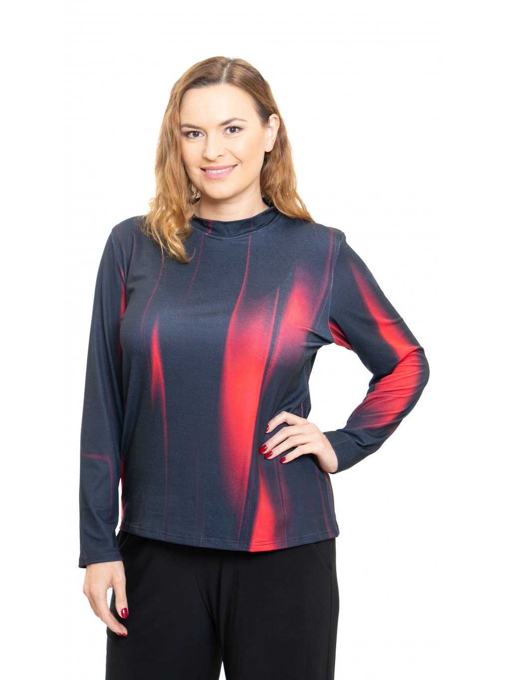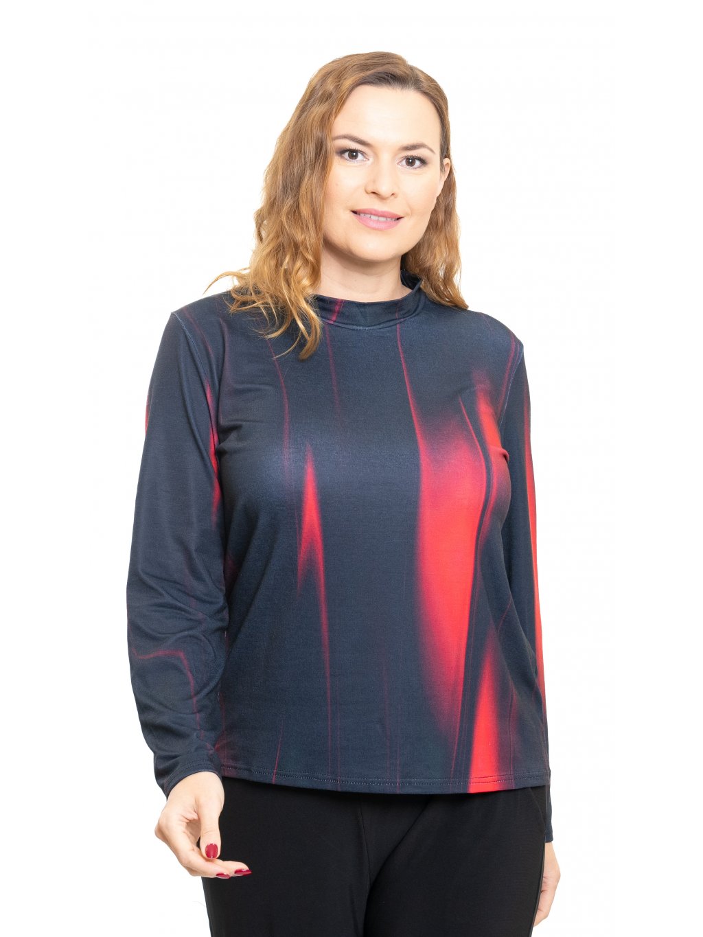 Klasická blúzka so stojačikom z príjemného úpletu s elastanom v digitálnej tlači.