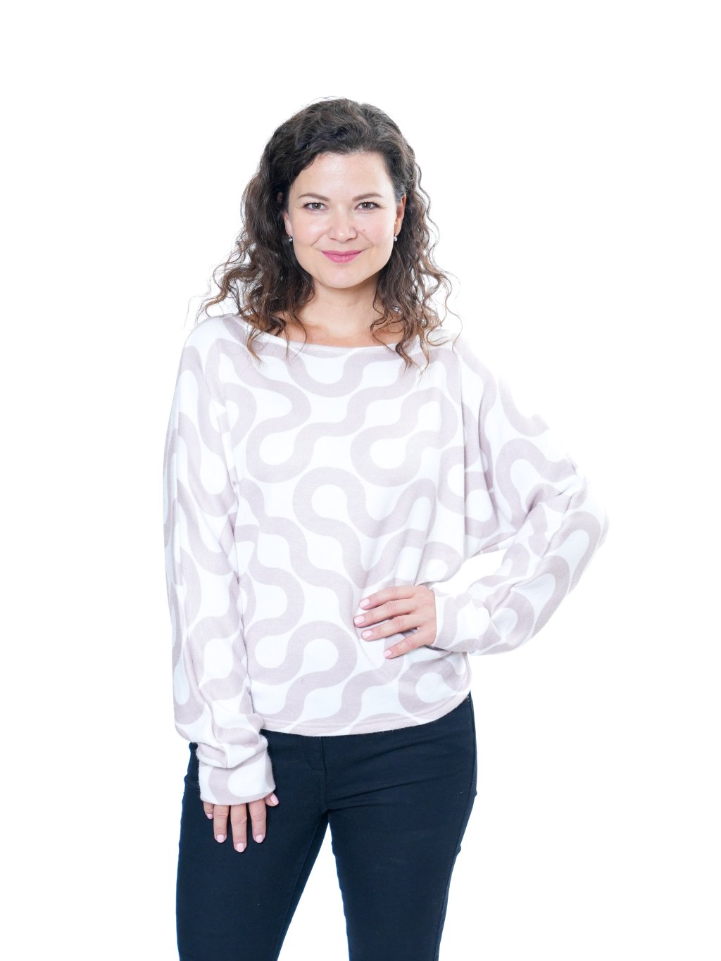 Pulóver má lodičkový výstrih, netopierie rukávy ukončené manžetou pre ľahké podkasanie a na oboch bokoch mierne riasenie.
