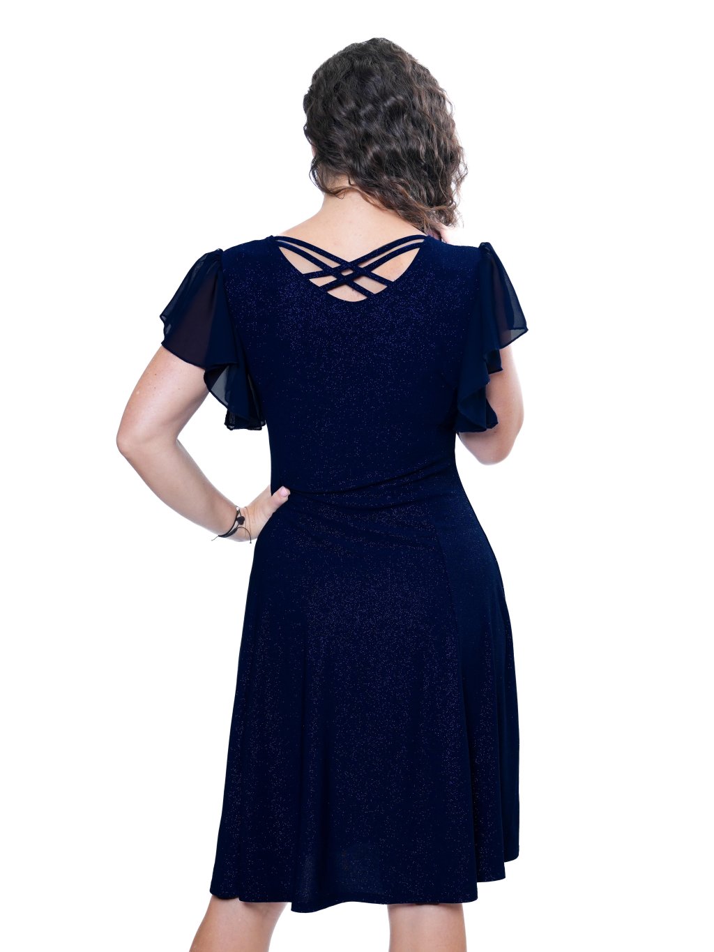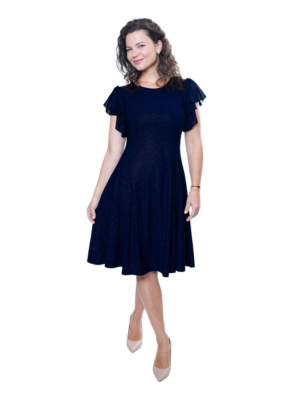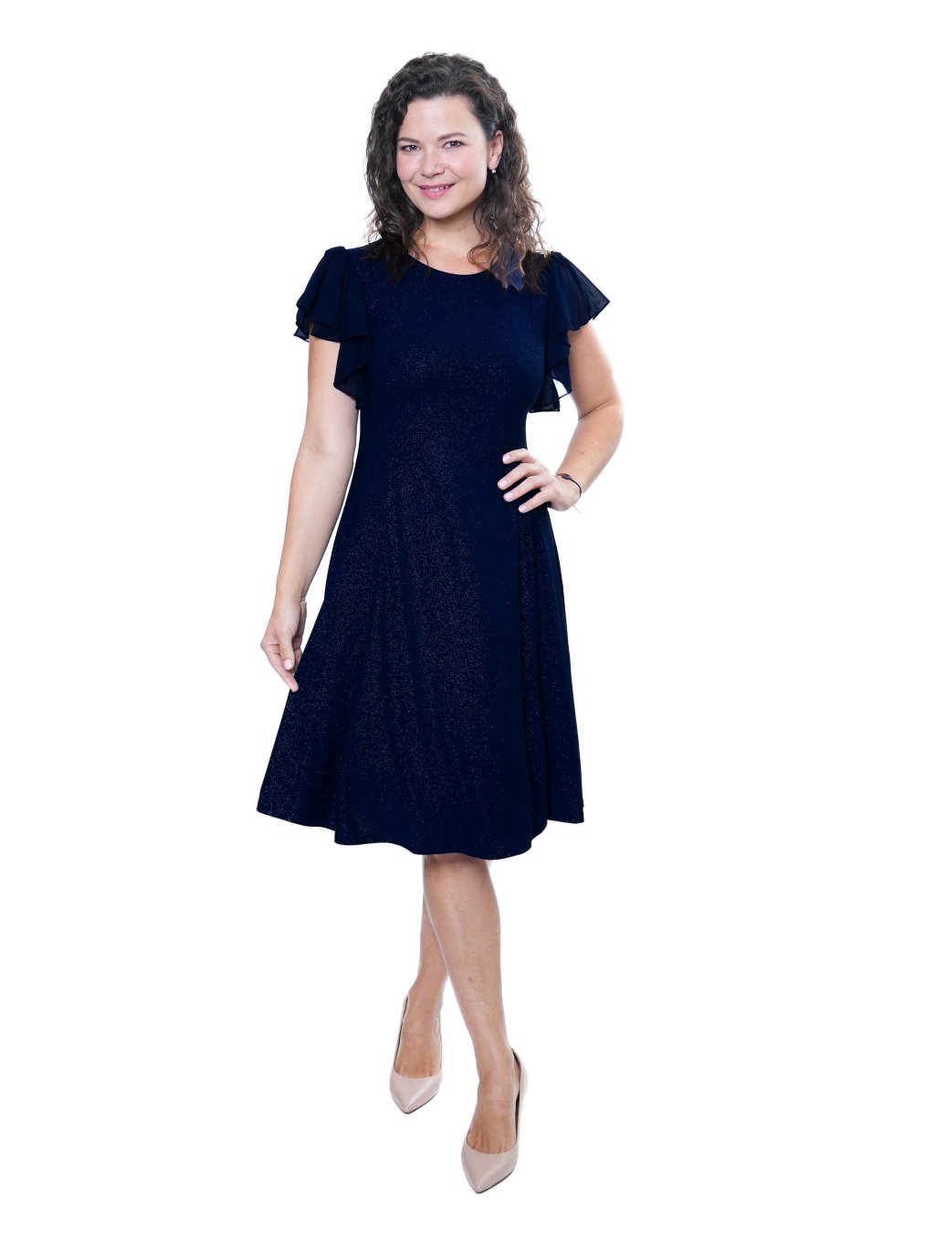 - Spoločenské šaty princesového strihu z ľahkého splývavého úpletu s trblietkami jemných flitrov a motýlími šifónovými rukávmi.