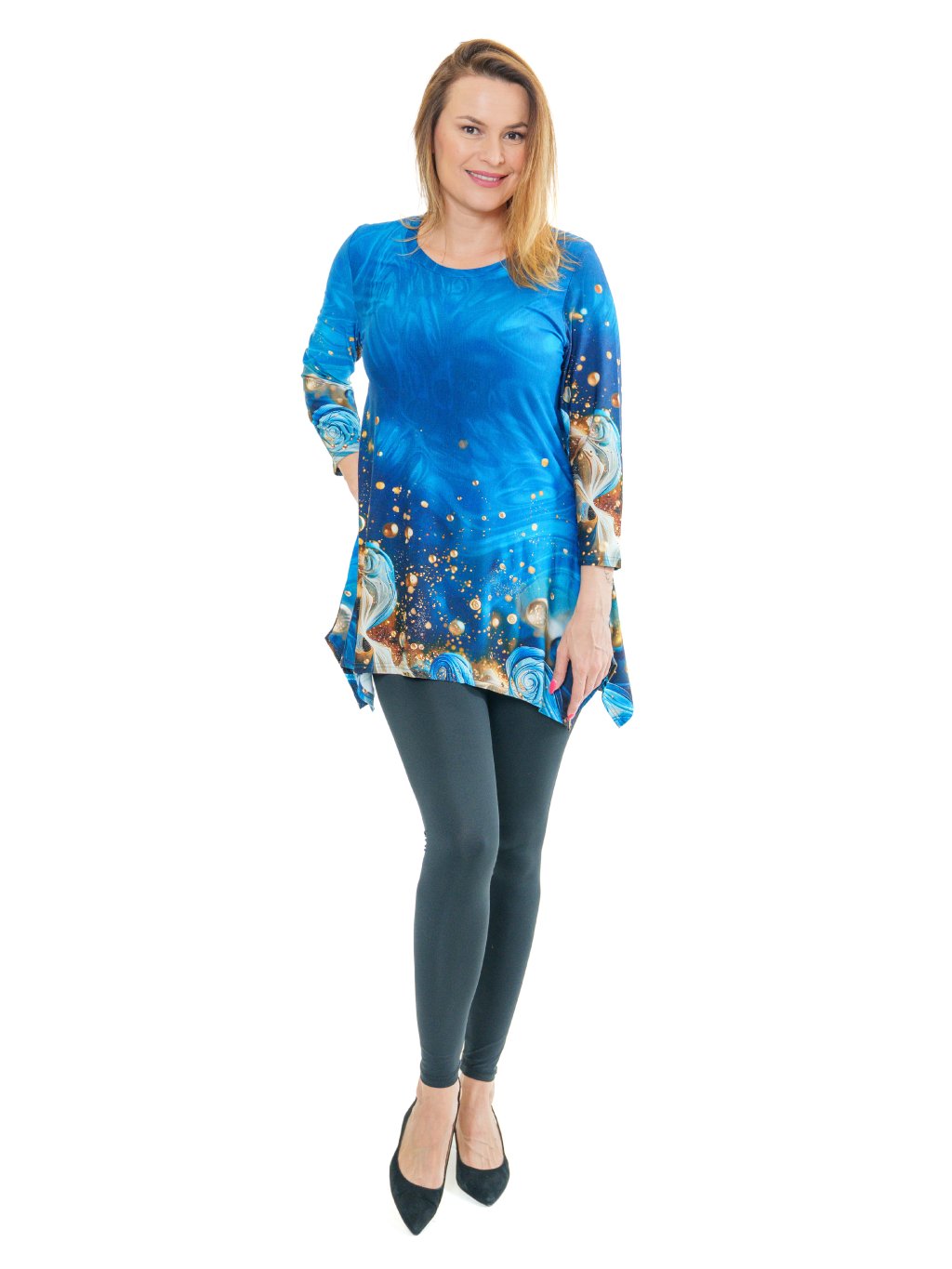 Tunika je vyrobená z viskózového úpletu s prímesou elastanu. Veľmi dobre padnúci strih postavám so širšími bokmi. Elegantná čierna farba so zaujímavým farebným motívom v digitálnej tlači.