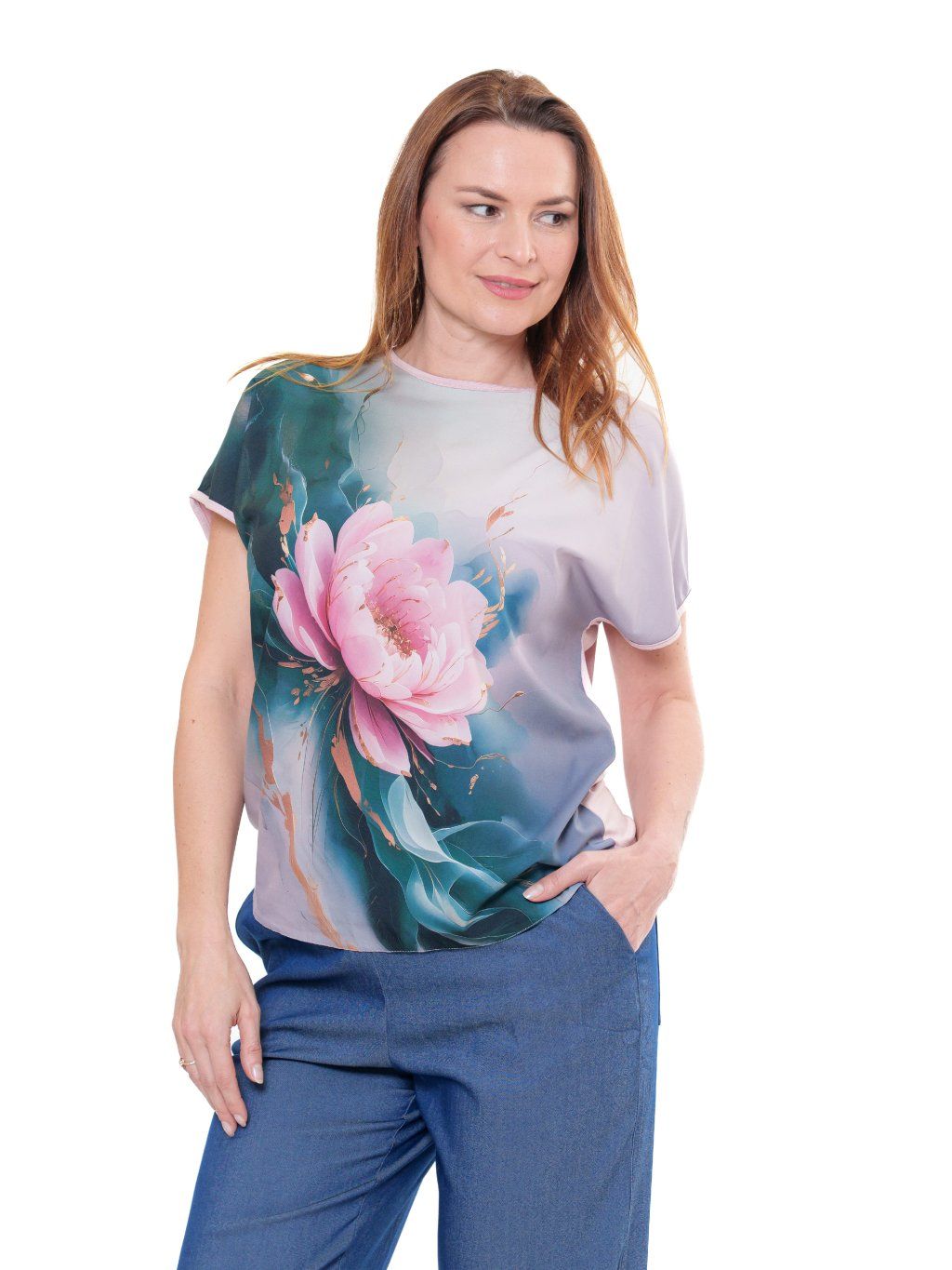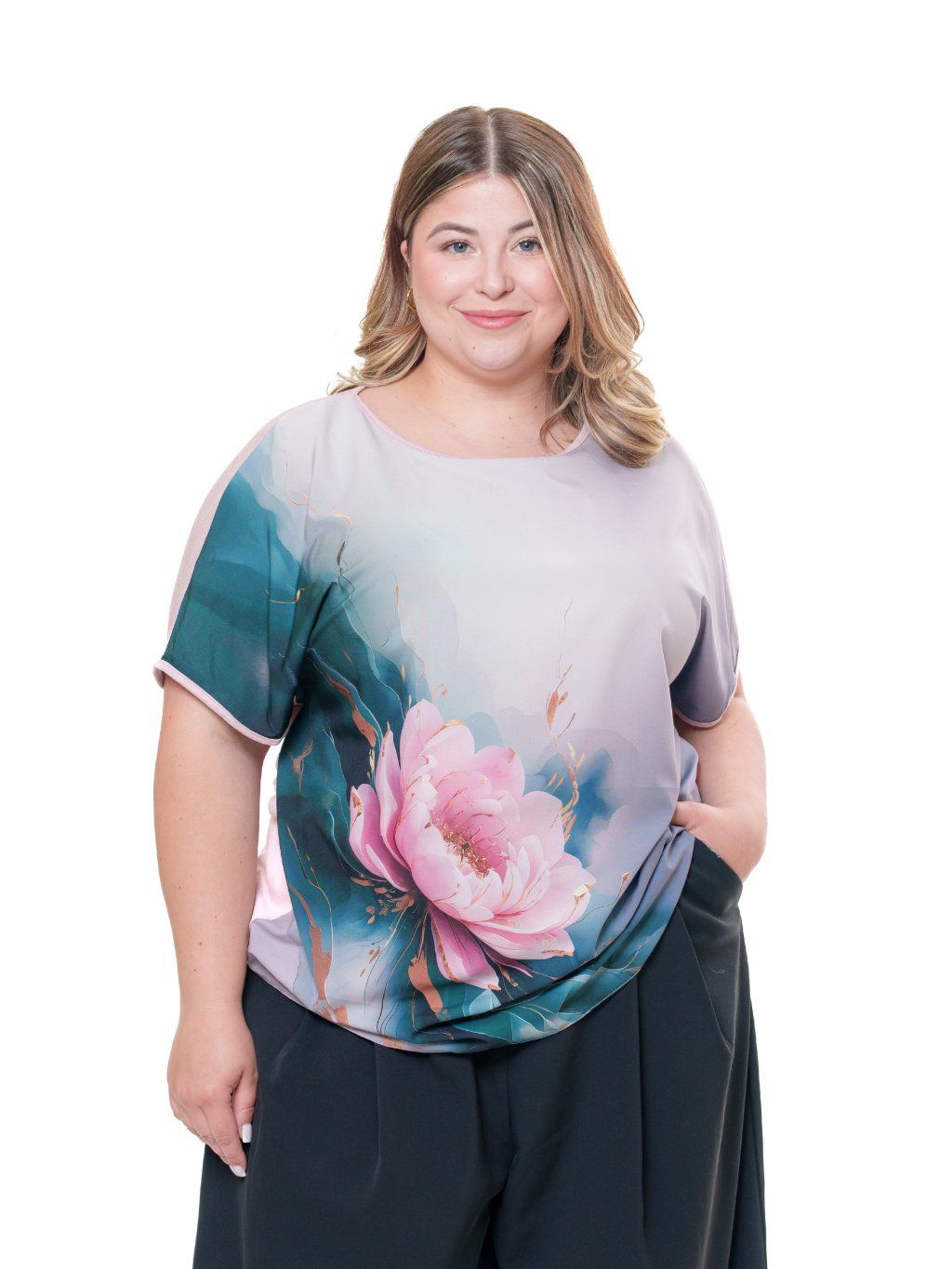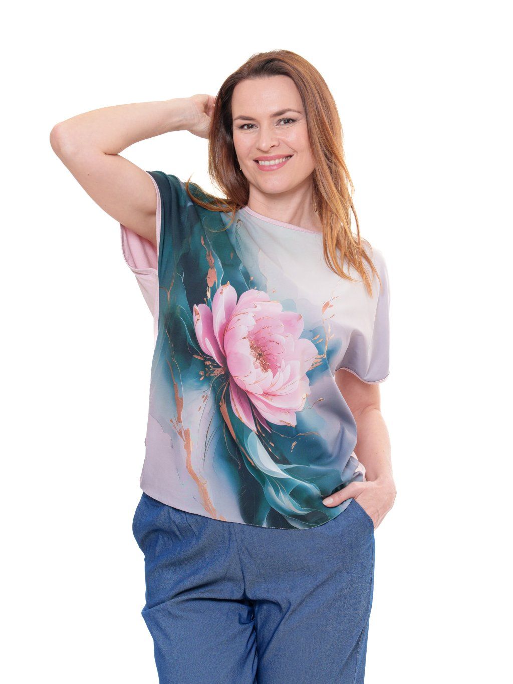 Halenka je vyrobená z umělého hedvábí s příměsí elastanu s digitálním tiskem (přední díl) v kombinaci s jemným jednobarevným viskózovým úpletem (zadní díl).