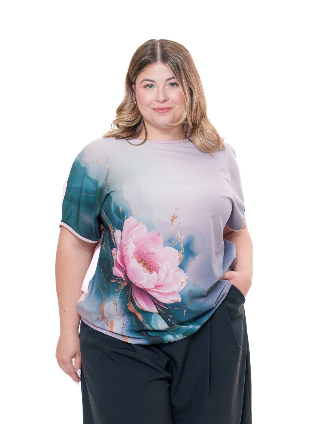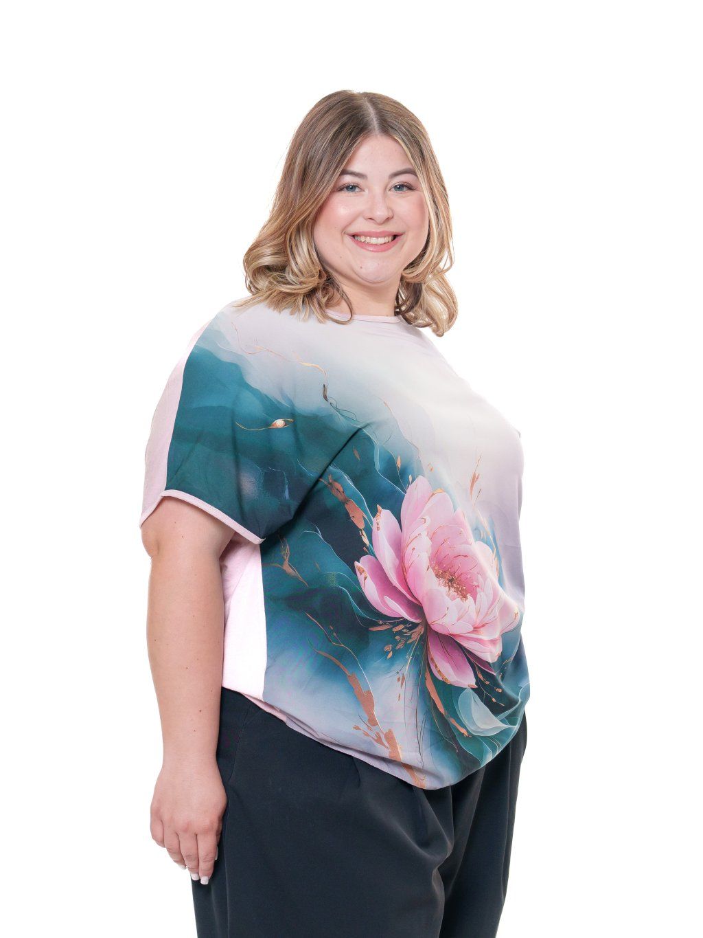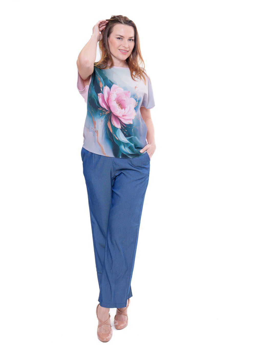 Halenka je vyrobená z umělého hedvábí s příměsí elastanu s digitálním tiskem (přední díl) v kombinaci s jemným jednobarevným viskózovým úpletem (zadní díl).