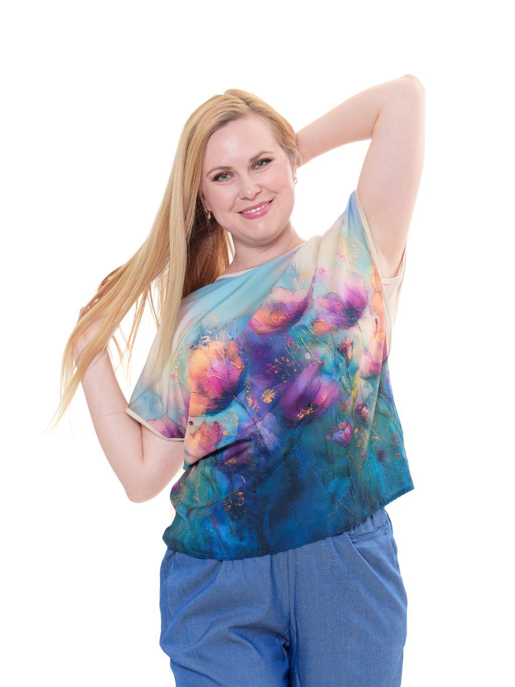 Halenka je vyrobená z umělého hedvábí s příměsí elastanu s digitálním tiskem (přední díl) v kombinaci s jemným jednobarevným viskózovým úpletem (zadní díl).