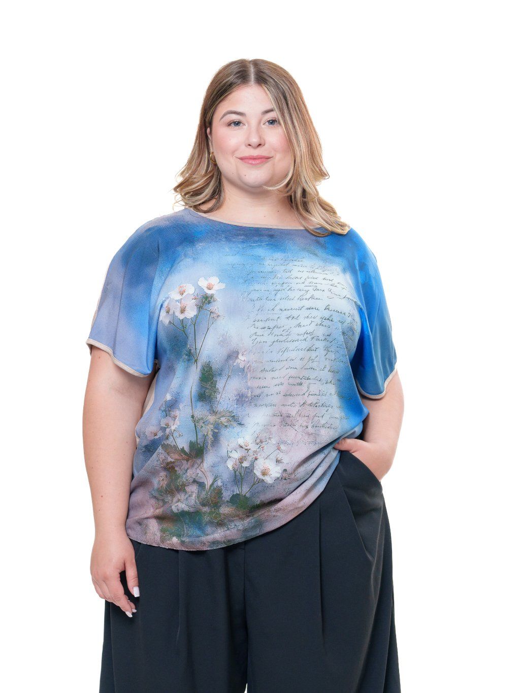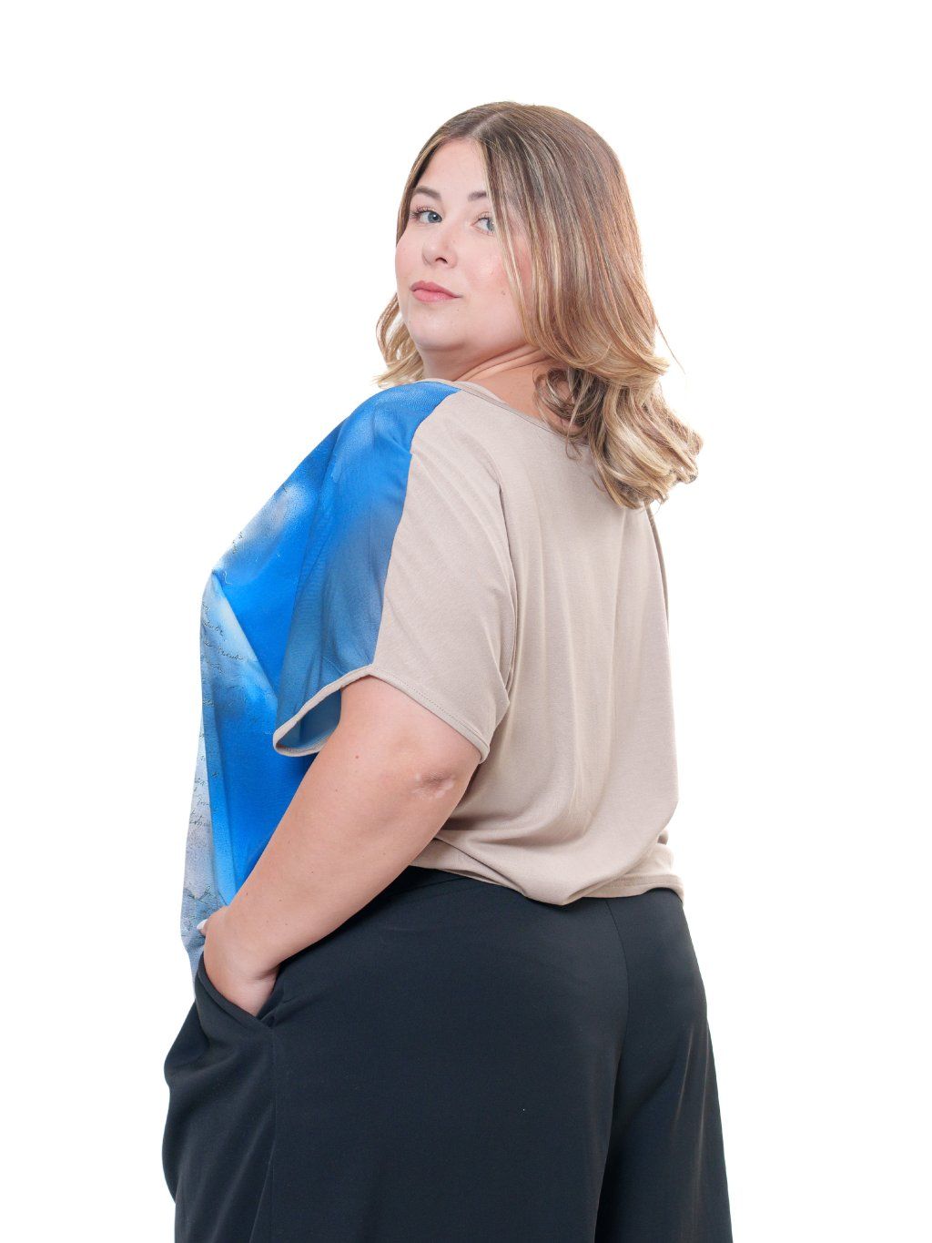 Halenka je vyrobená z umělého hedvábí s příměsí elastanu s digitálním tiskem (přední díl) v kombinaci s jemným jednobarevným viskózovým úpletem (zadní díl).