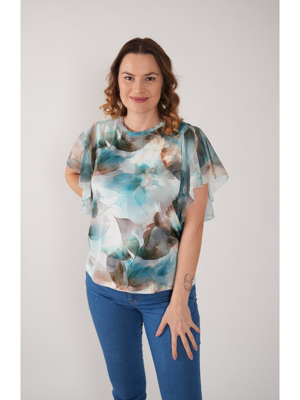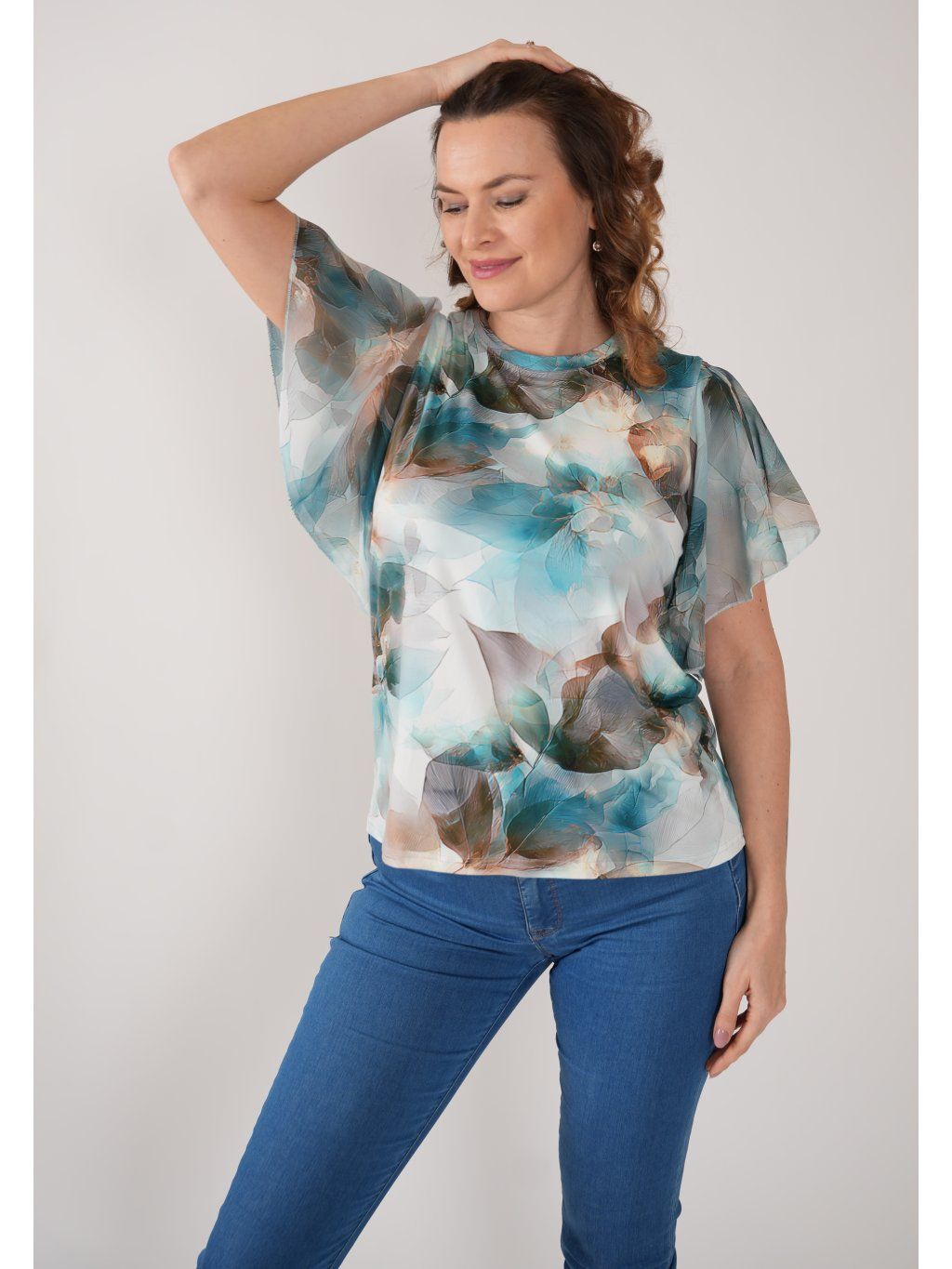 Halenka z příjemného směsového úpletu s digitálním tiskem s motýlkovým šifonovým rukávem. Vhodná do společnosti i k běžnému nošení.
