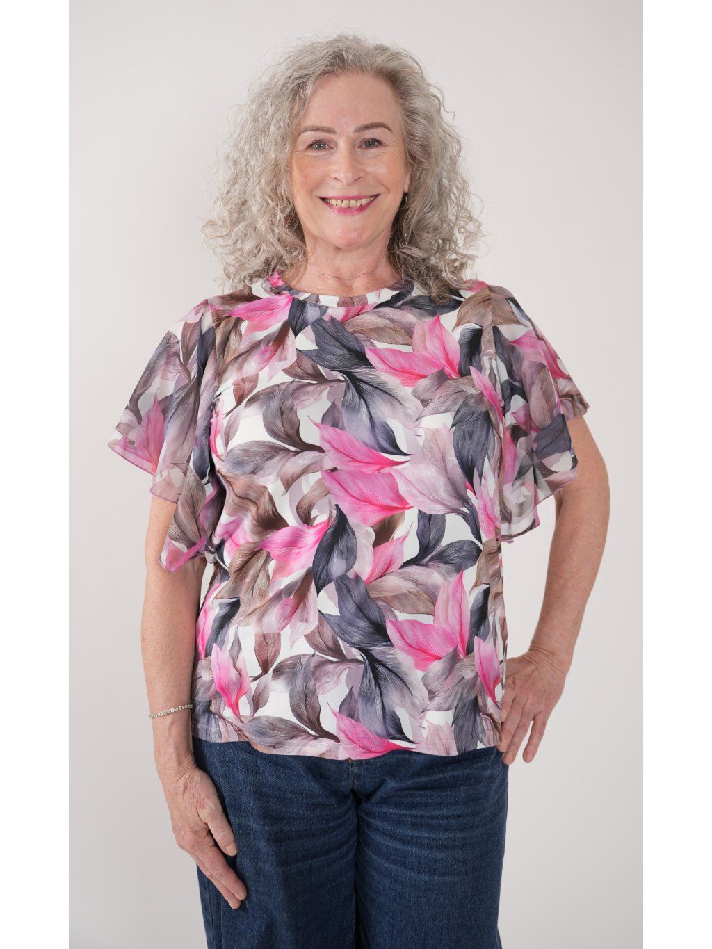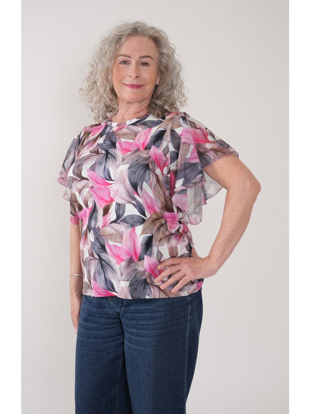 Halenka z příjemného směsového úpletu s digitálním tiskem s motýlkovým šifonovým rukávem.  Vhodná do společnosti i k běžnému nošení.