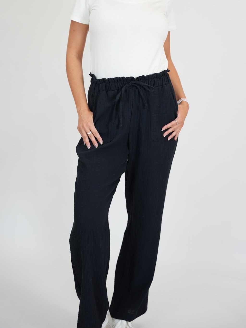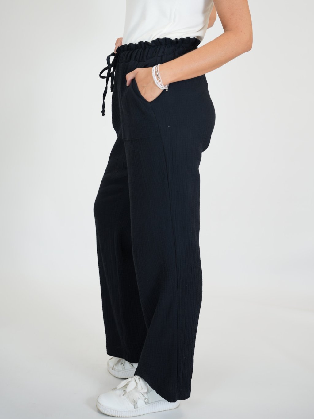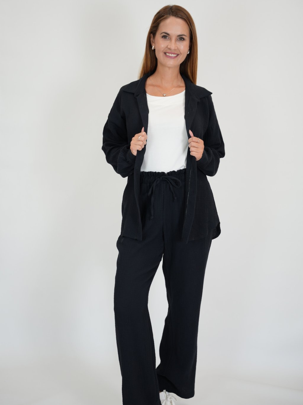 Volné kalhoty v pase do gumy z vázačkou a kapsami z lehkého bavlněného mušelínu. Můžete je kombinovat s košilí INES.