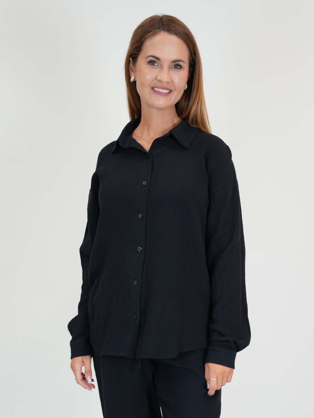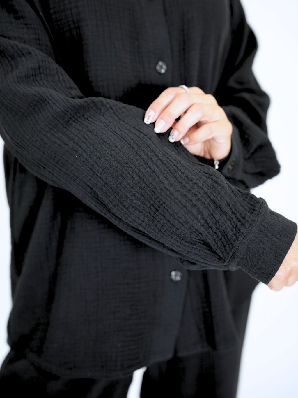 Volná košile s prodlouženým zadním dílem z lehkého bavlněného mušelínu. Můžete ji kombinovat s kalhotami INGRID a halenkou z viskosového úpletu DANA nebo HANA.