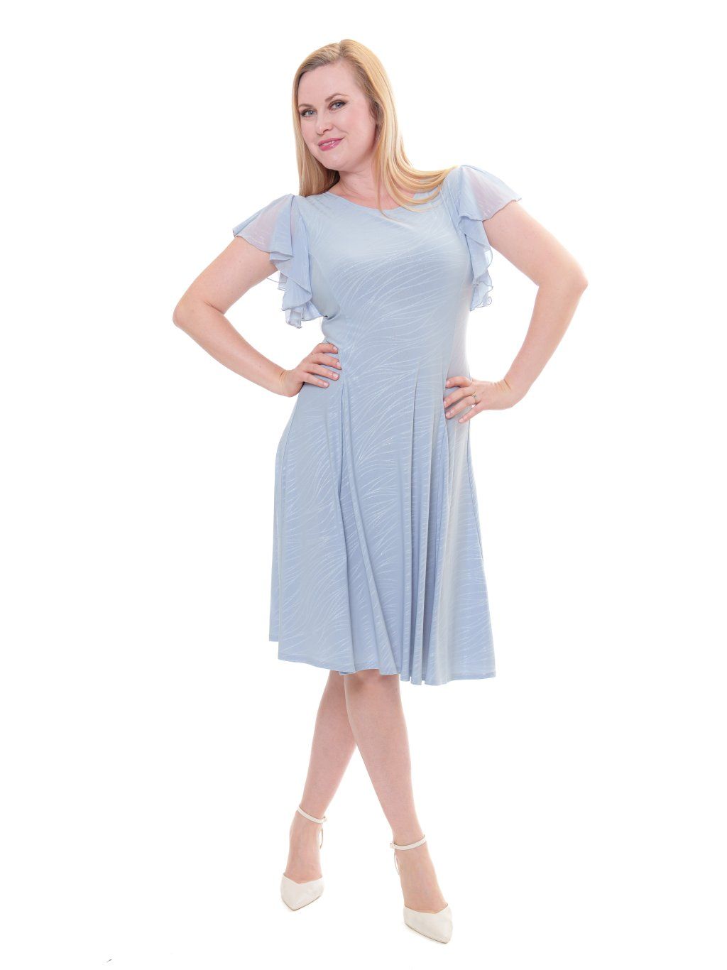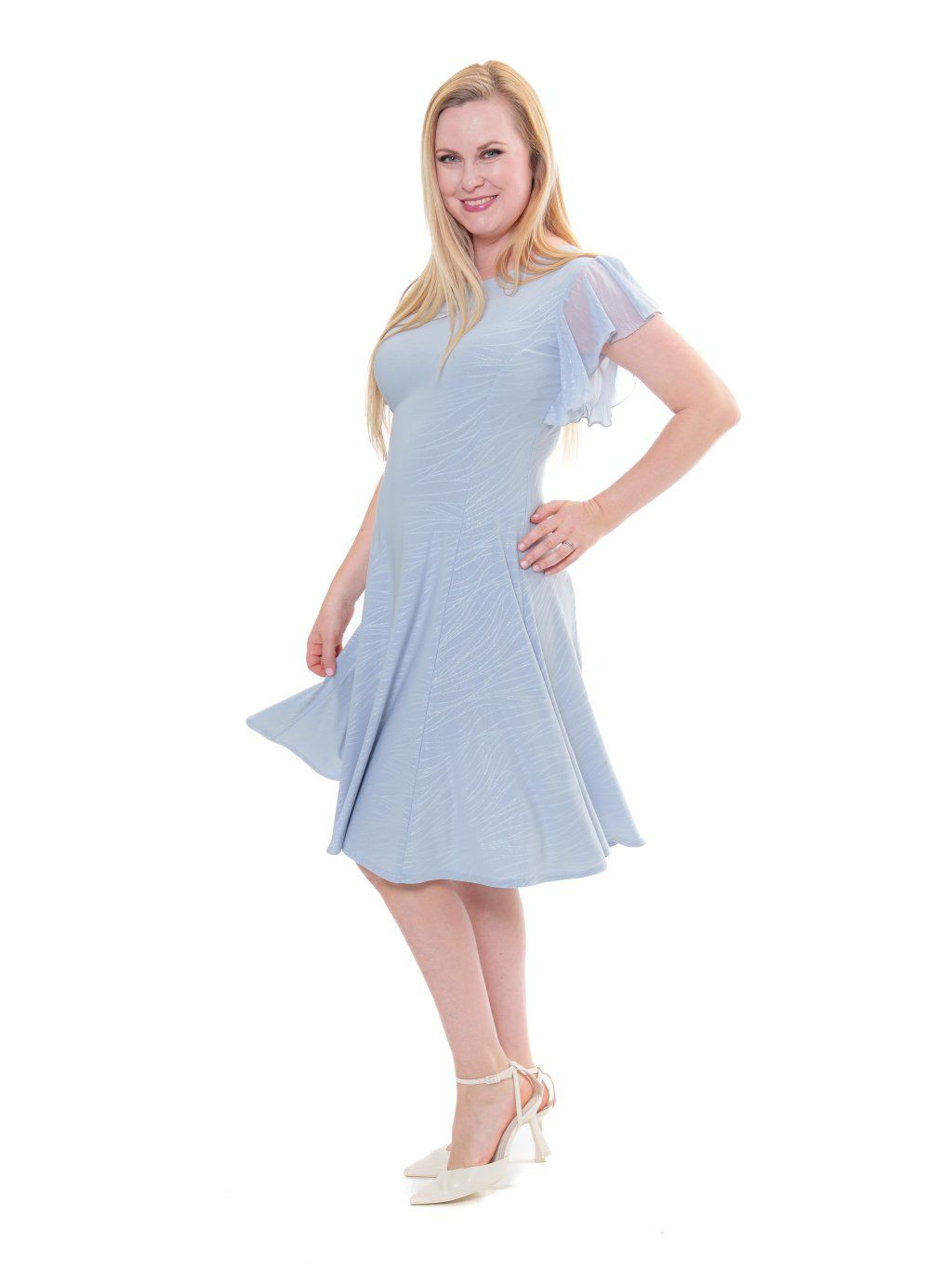 - Společenské šaty princesového střihu z lehkého splývavého úpletu s jemným třpytem a motýlími šifonovými rukávy.