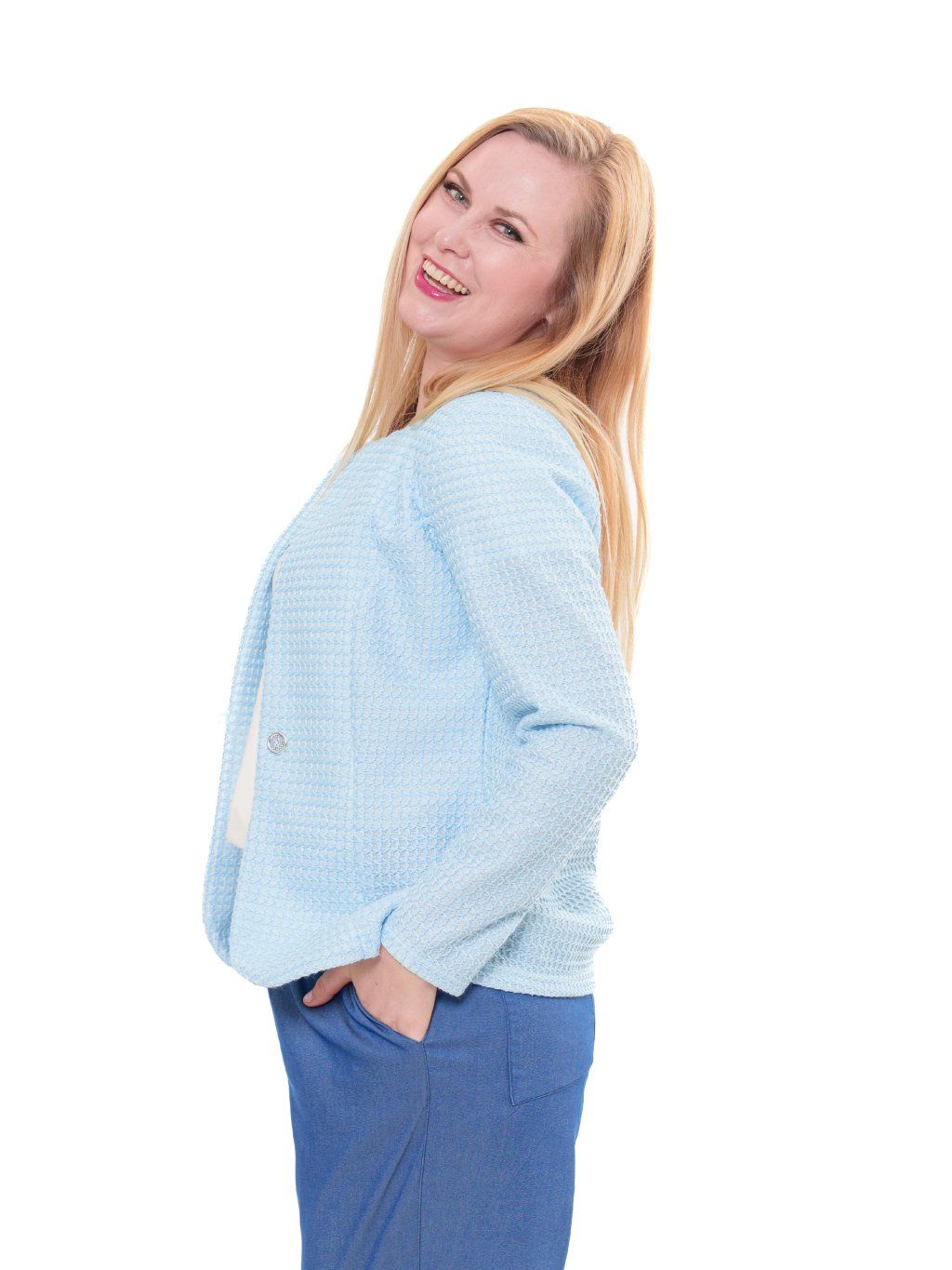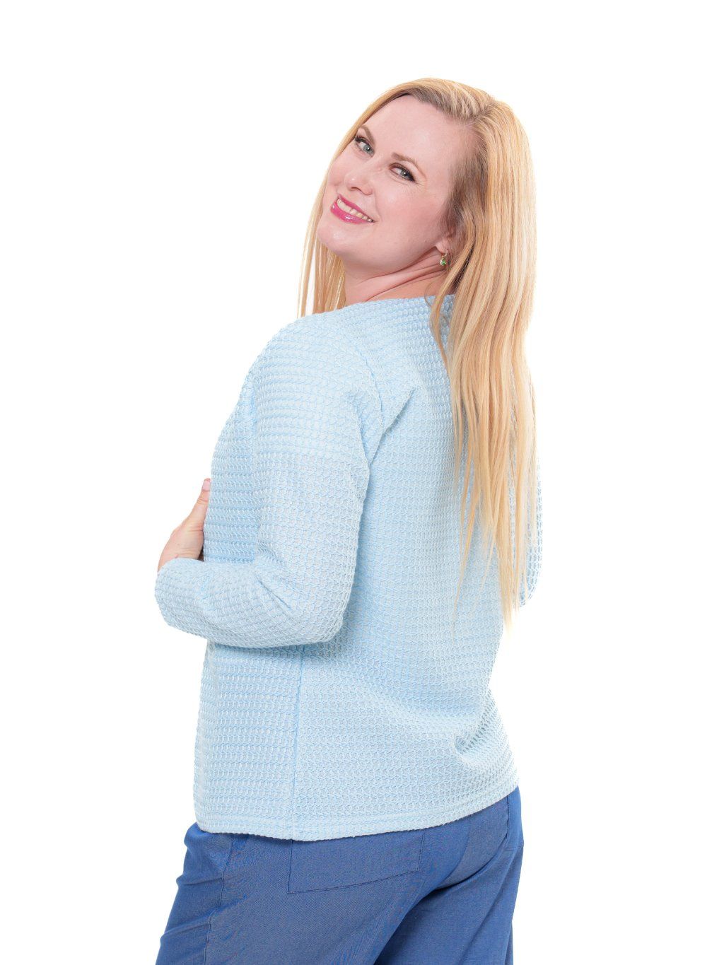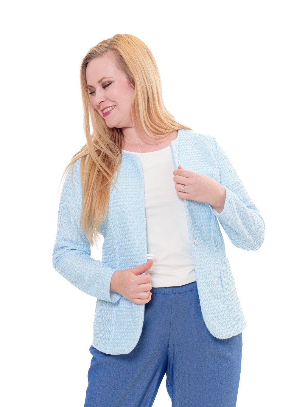 Sako je vyrobené ze směsového úpletu ve vaflovém vzoru.