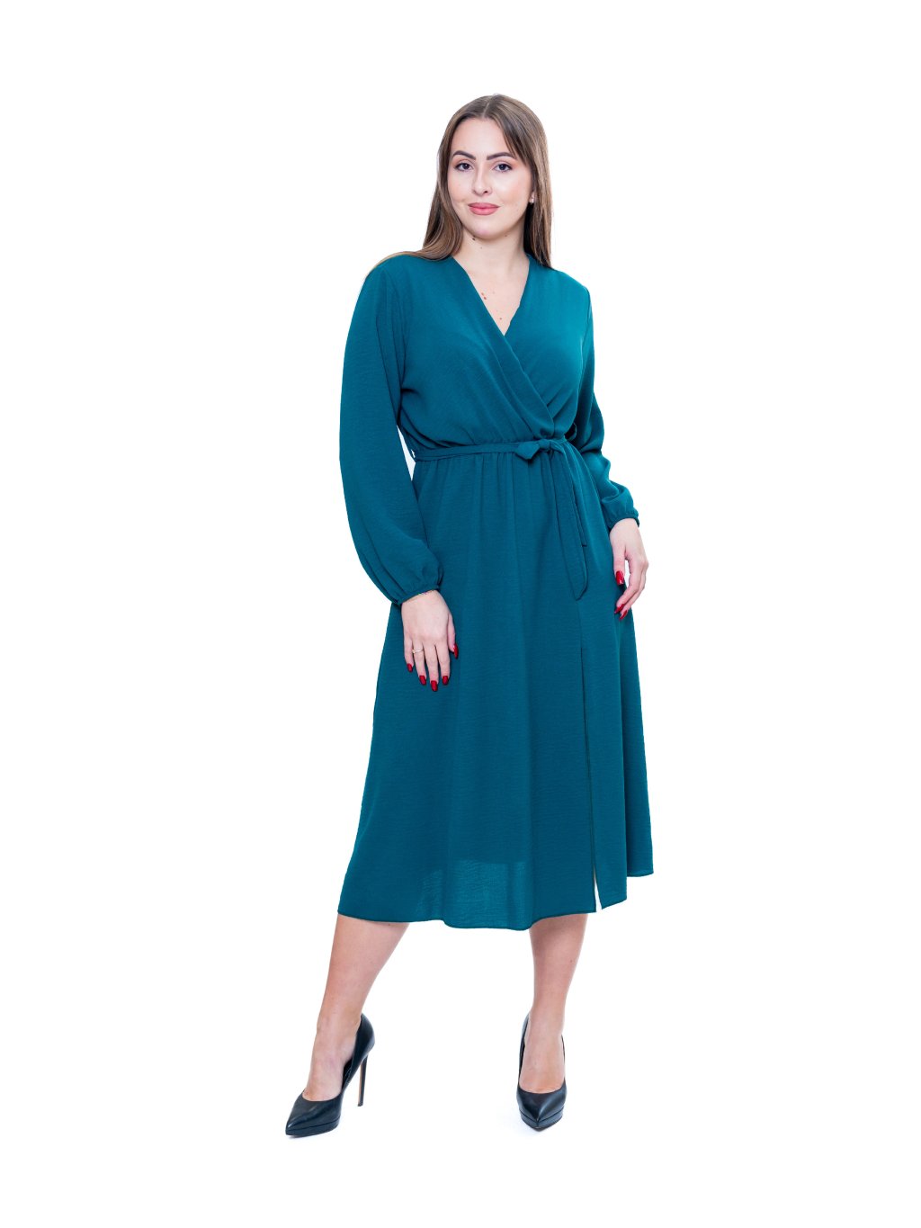Šaty ze vzdušné jemně krepované viskózy ve směsi s elastanem, s překříženým výstřihem a všitou gumičkou v pase, doplněné páskem .