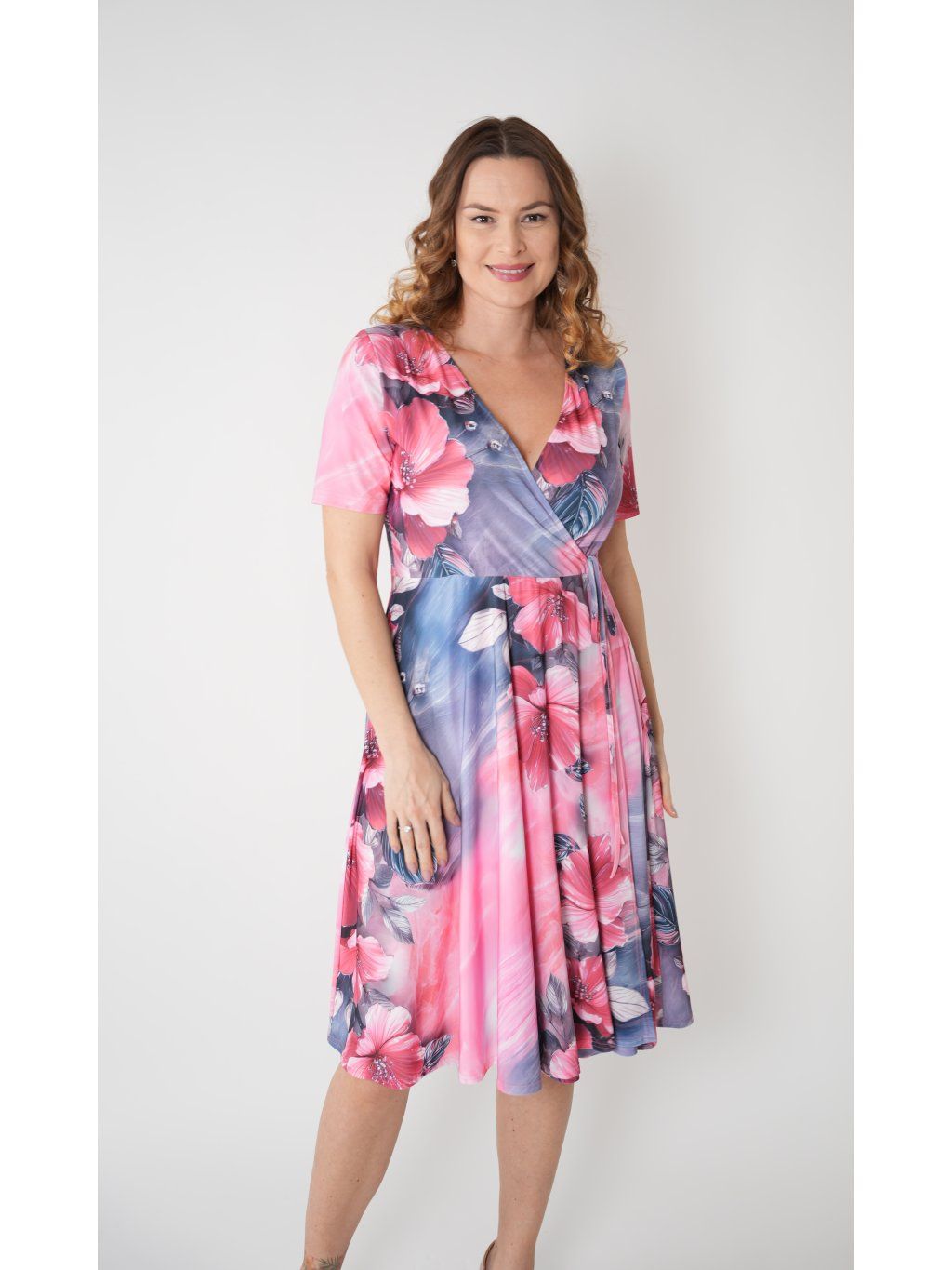 Šaty přestřižené v pase s všitou gumičkou a vázačkou, s překládaným výstřihem a rozšiřenou zavinovací sukní splývající přes boky.