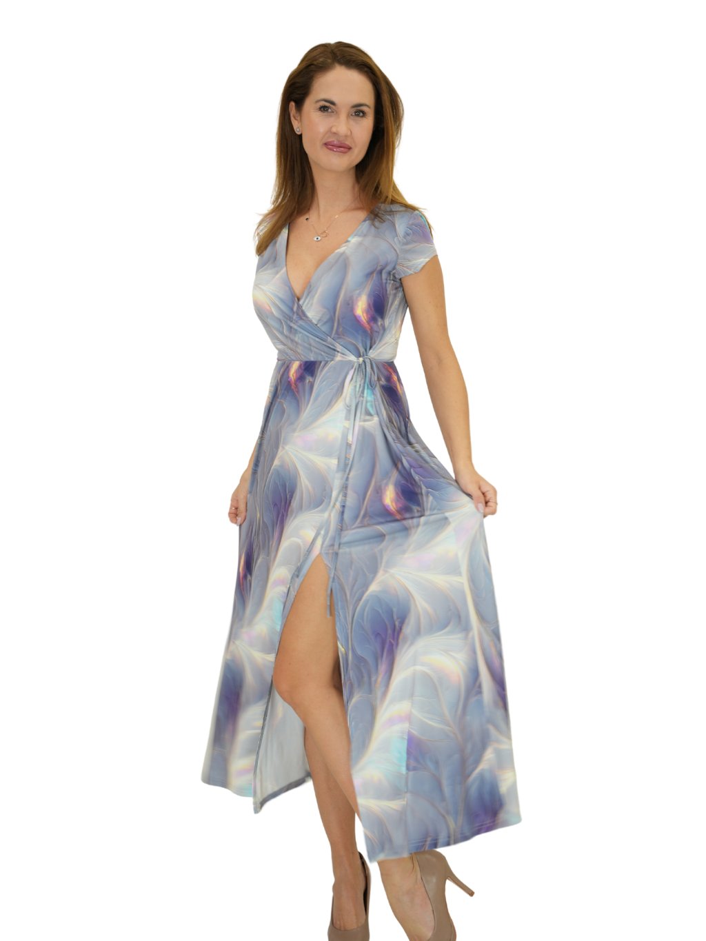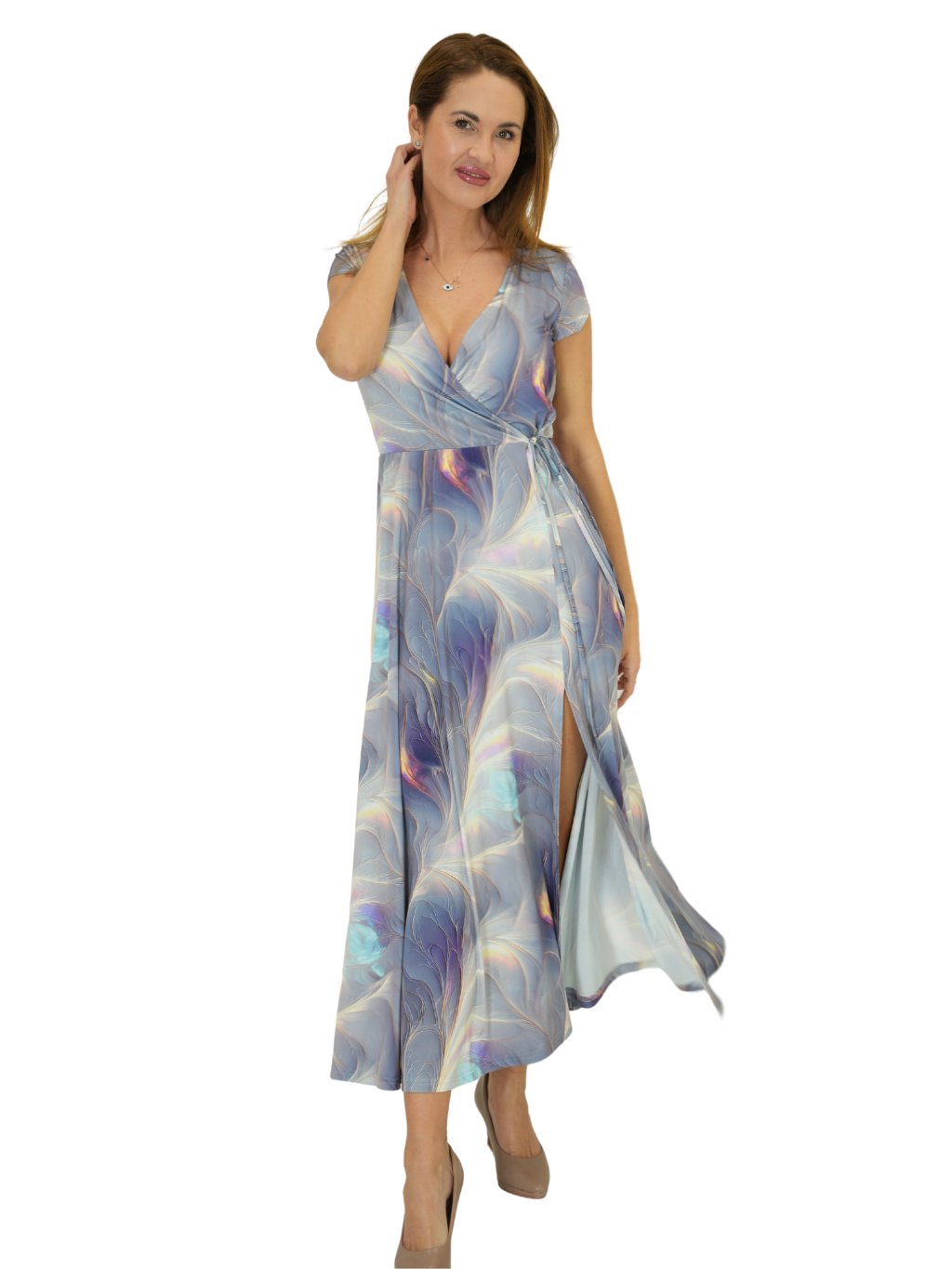Šaty ze směsového chladivého úpletu s elastanem v digitálním tisku. Fazona má přeložený výstřih, v pase všitou gumičku a vázačku, s rozparkem na levou nohu. Velmi oblíbený a dobře padnoucí střih. Šaty jsou splývavé a velmi elegantní.