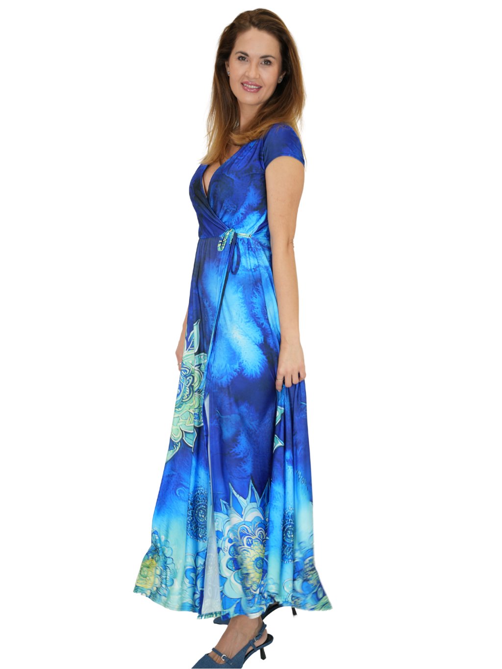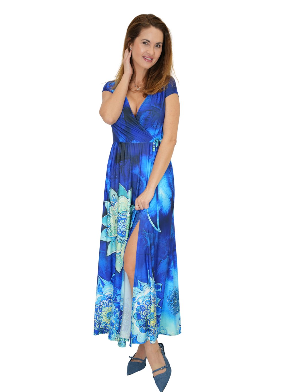 Šaty ze směsového chladivého úpletu s elastanem v digitálním tisku. Fazona má přeložený výstřih, v pase všitou gumičku a vázačku, s rozparkem na levou nohu. Velmi oblíbený a dobře padnoucí střih. Šaty jsou splývavé a velmi elegantní.