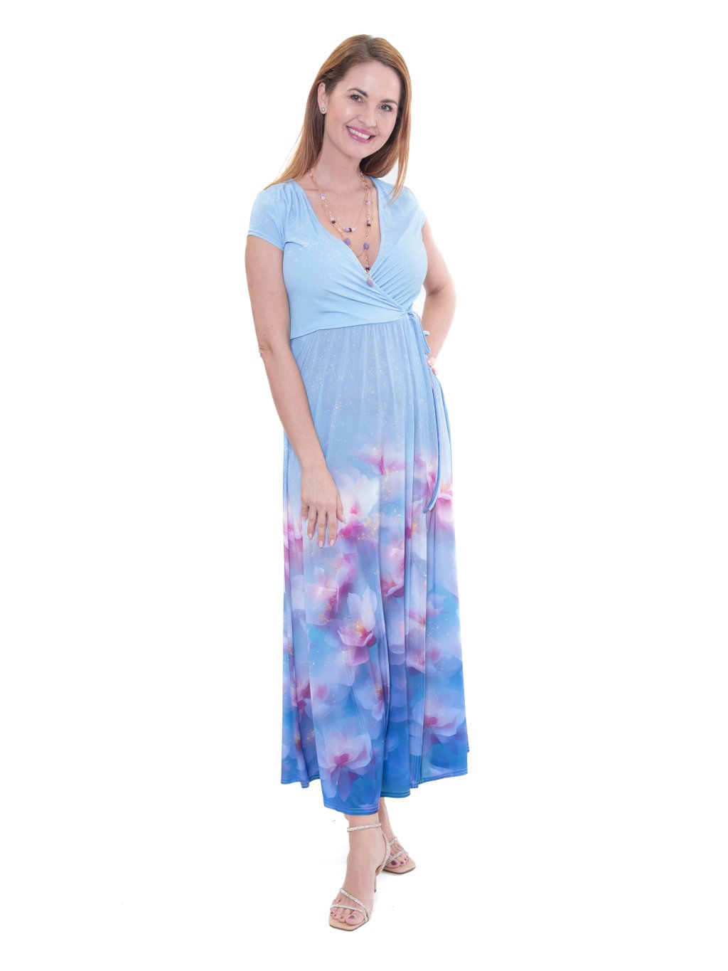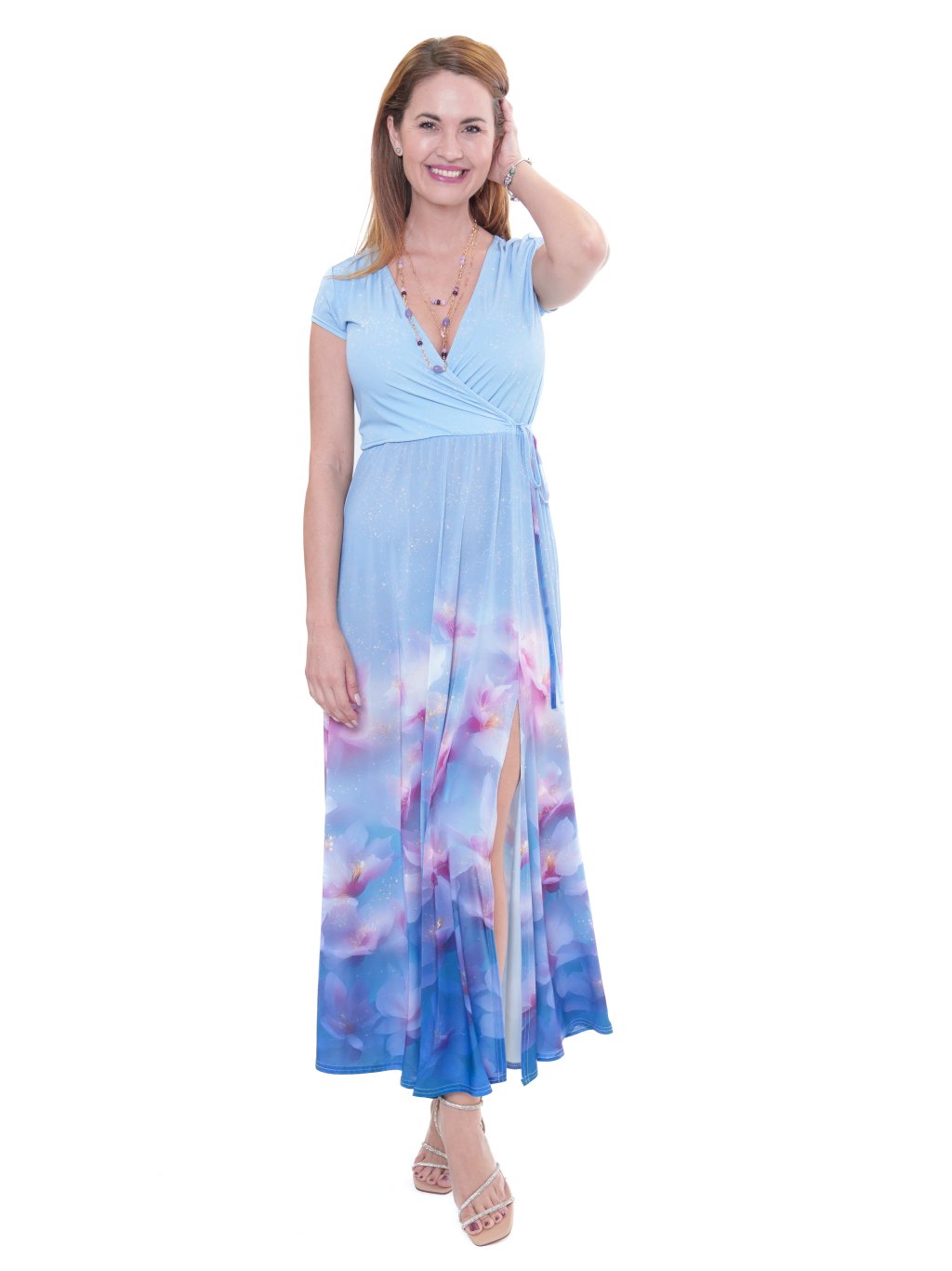 Šaty ze směsového chladivého úpletu s elastanem v digitálním tisku. Fazona má přeložený výstřih, v pase všitou gumičku a vázačku, s rozparkem na levou nohu. Velmi oblíbený a dobře padnoucí střih. Šaty jsou splývavé a velmi elegantní.