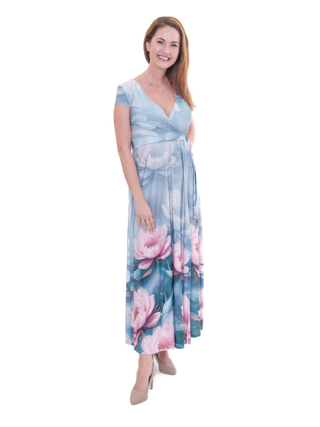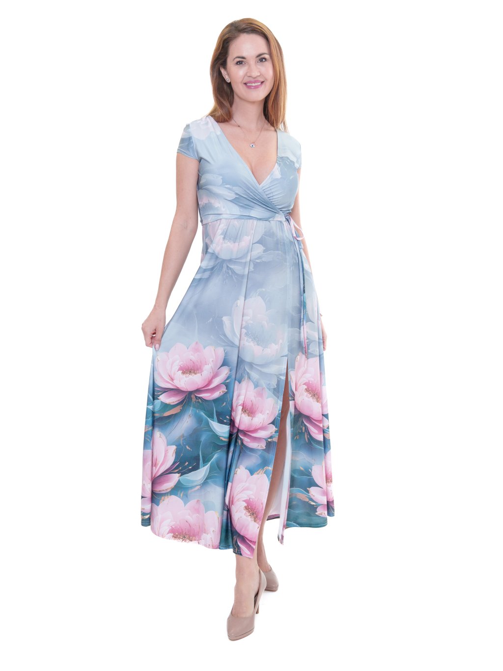 Šaty ze směsového chladivého úpletu s elastanem v digitálním tisku. Fazona má přeložený výstřih, v pase všitou gumičku a vázačku, s rozparkem na levou nohu. Velmi oblíbený a dobře padnoucí střih. Šaty jsou splývavé a velmi elegantní.