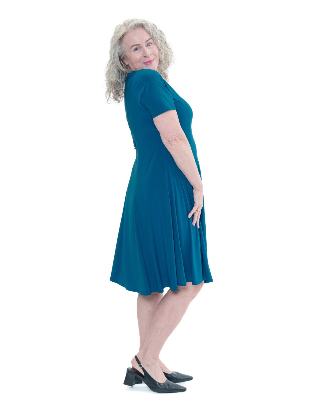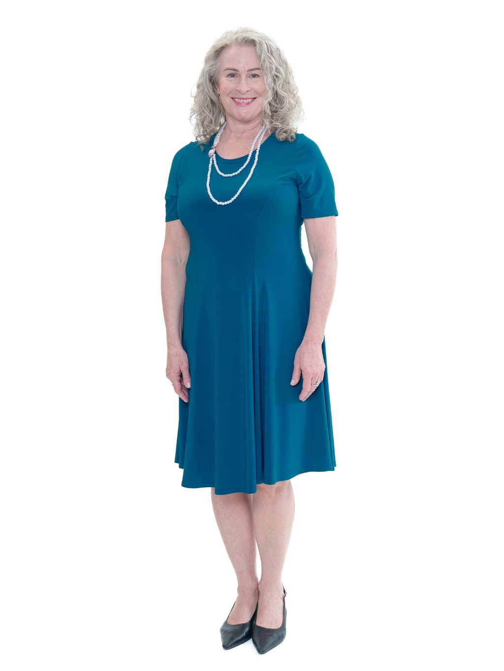 Jednobarevné šaty princesového střihu s rozšiřenou sukní z jemného splývavého úpletu s elastanem. Tento střih bez přestřižení v pase zvýrazní ženské křivky a sluší i postavám s širšími boky. Šaty jsou vhodné i ke společenským údálostem.