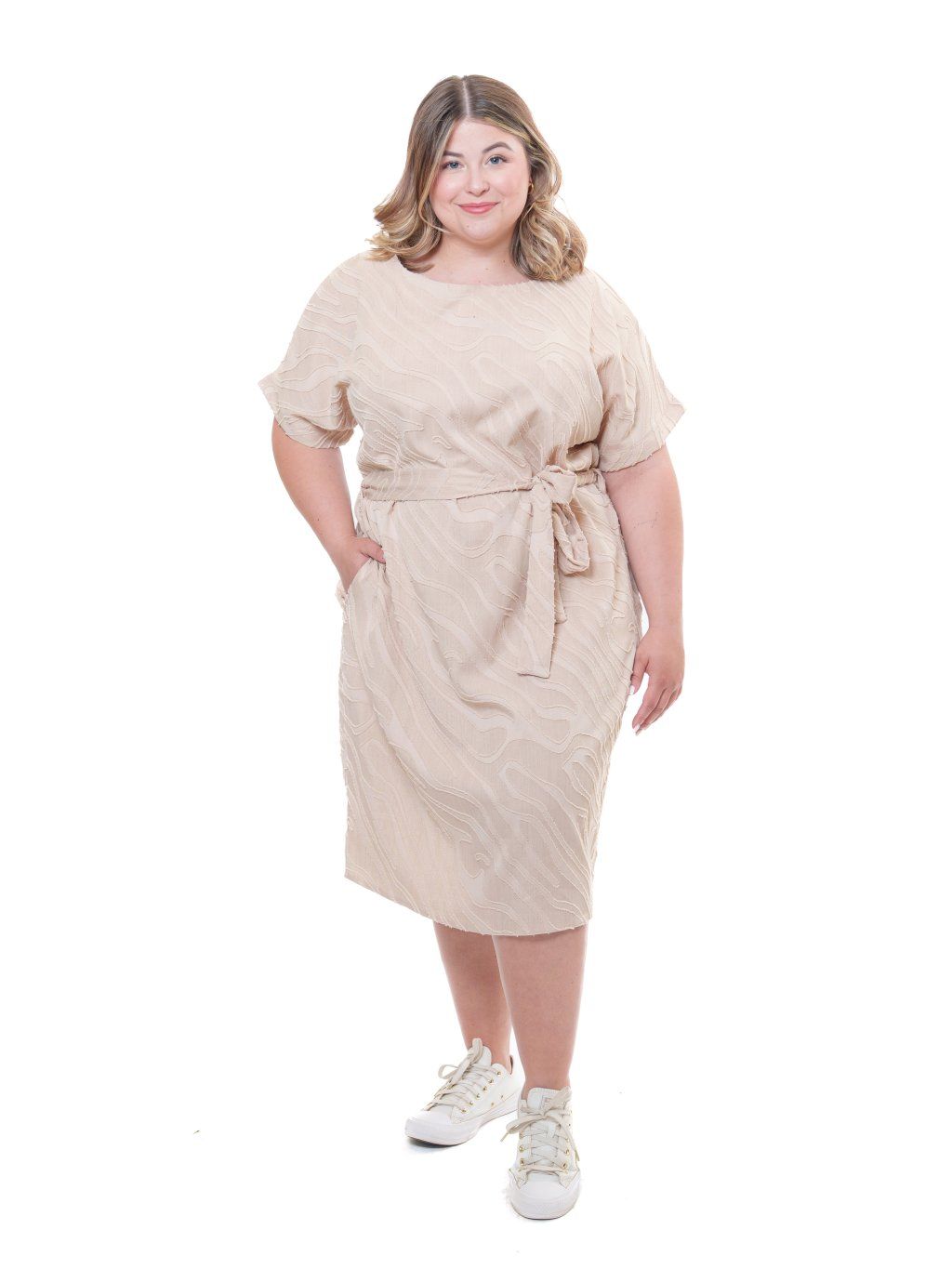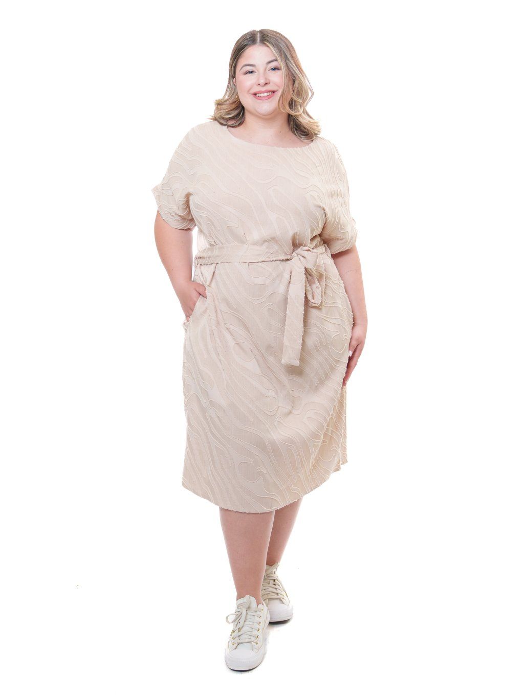 Šaty jednoduchého střihu doplněné páskem, ideální na léto. Tkanina je velmi příjemná s řezaným vzorováním vytvářející 3D efekt. Pozor, jedná se o nepružnou látku.
