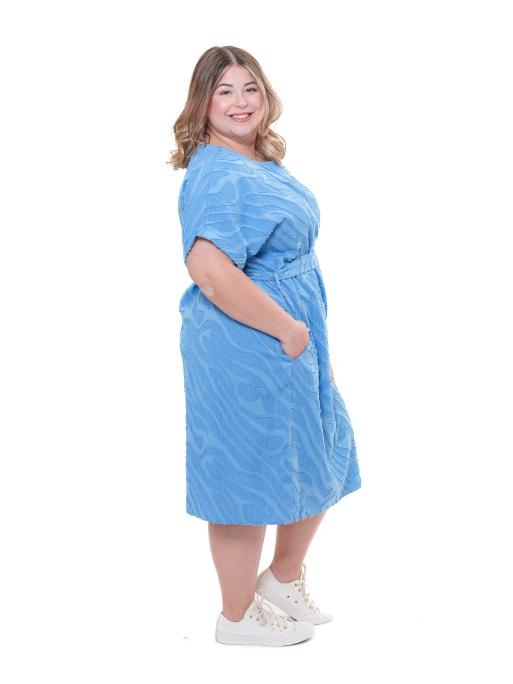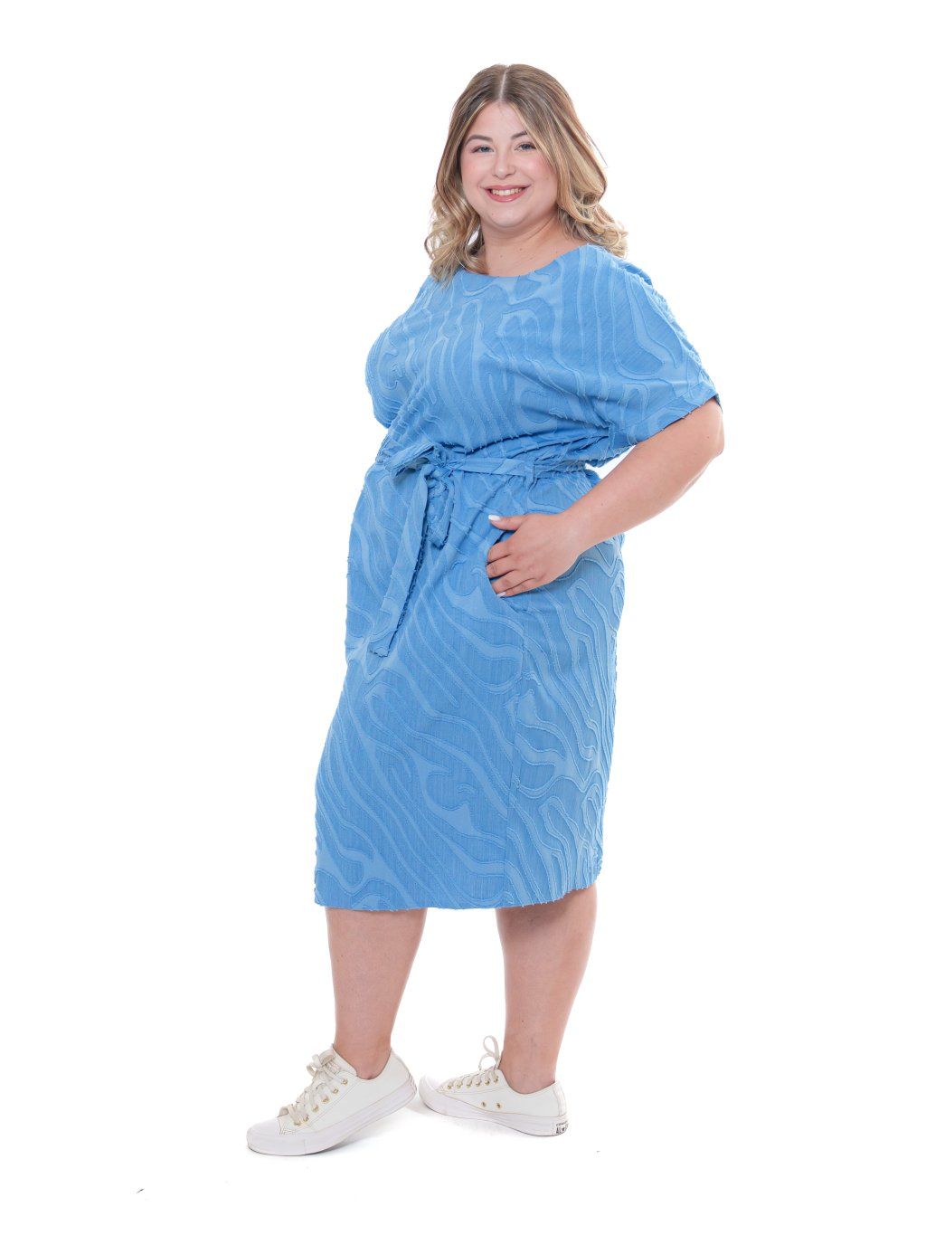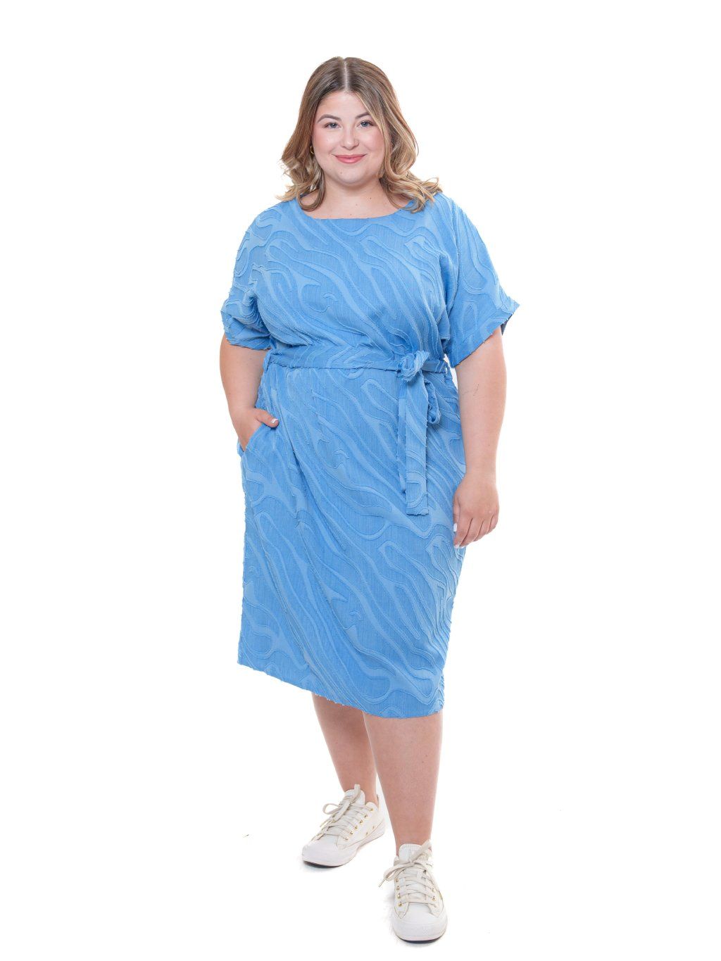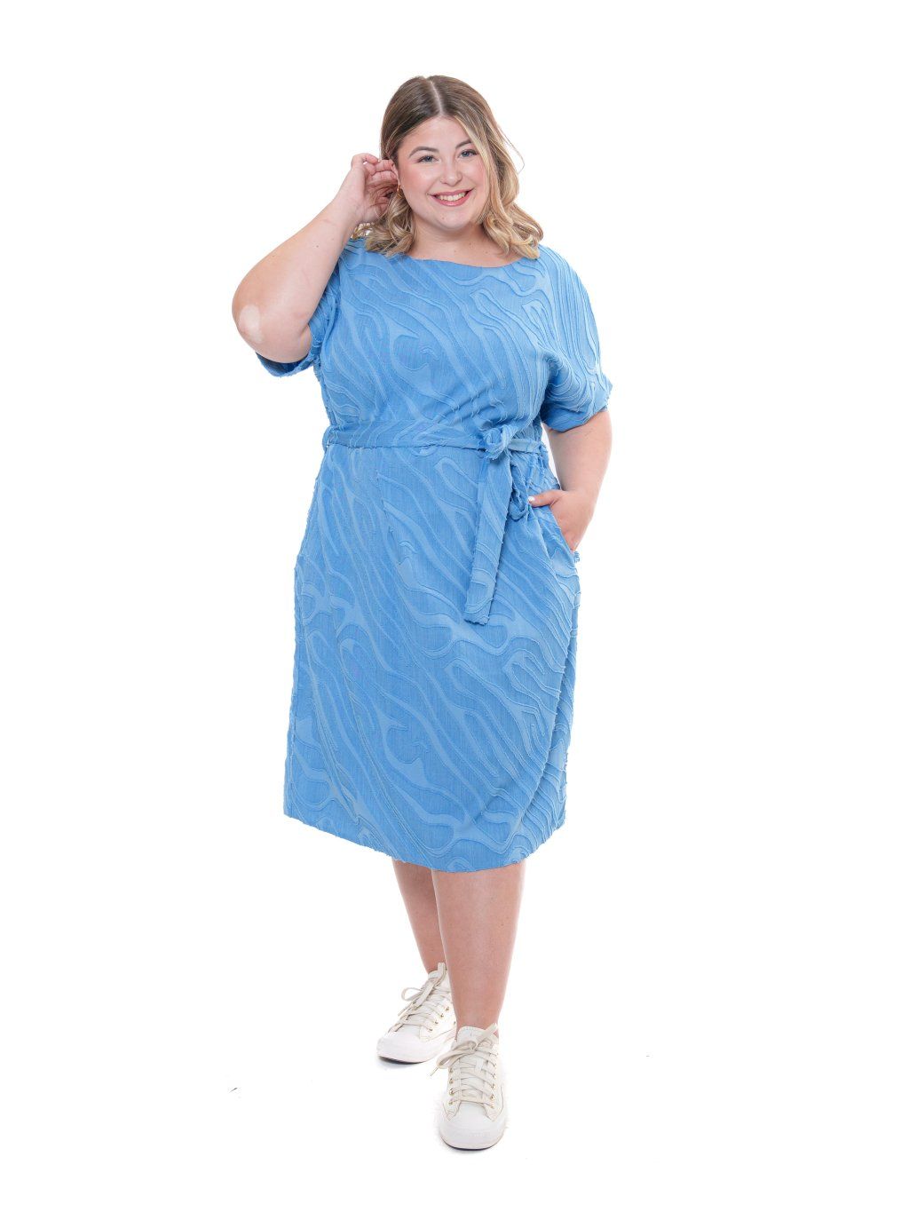 Šaty jednoduchého střihu doplněné páskem, ideální na léto. Tkanina je velmi příjemná s řezaným vzorováním vytvářející 3D efekt. Pozor, jedná se o nepružnou látku.