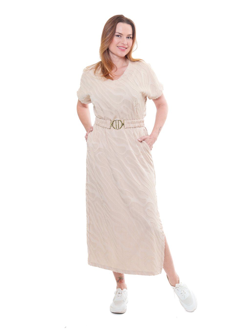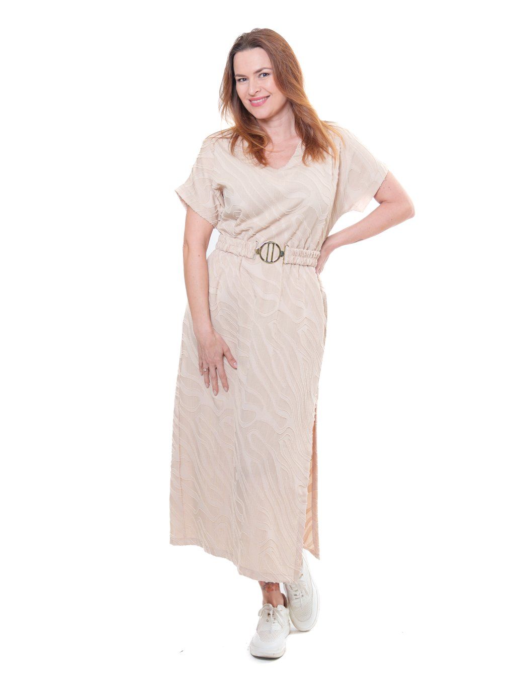 Dlouhé šaty jednoduchého střihu doplněné páskem s výraznou sponou. Tkanina je velmi příjemná s řezaným vzorováním vytvářející 3D efekt. Pozor, jedná se o nepružnou látku.