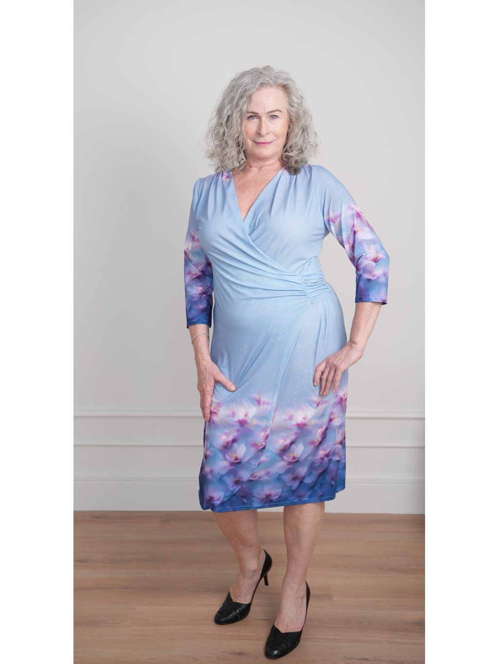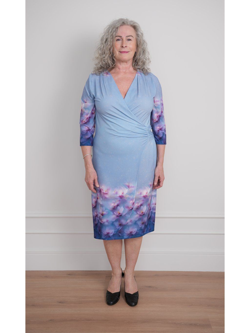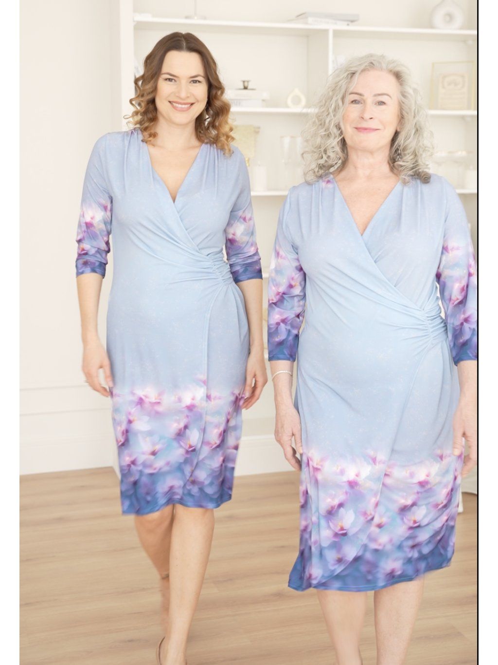 Elegantní šaty s bordurovým digitálním tiskem a 7/8 rukávem. Jsou vyrobené z jemného, splývavého, směsového úpletu s elastanem. Mají oblíbený střih s přeloženým výstřihem a jemně vraženou látkou na levém boku. Velmi snadná údržba, stačí lehce přeprat a usušit, není nutné žehlit. Šaty se nemačkají, vhodné do společnosti.