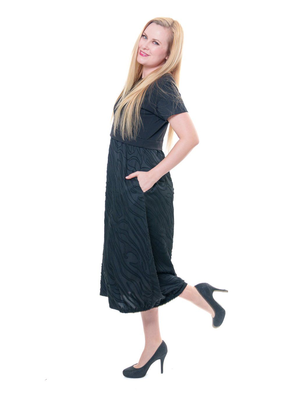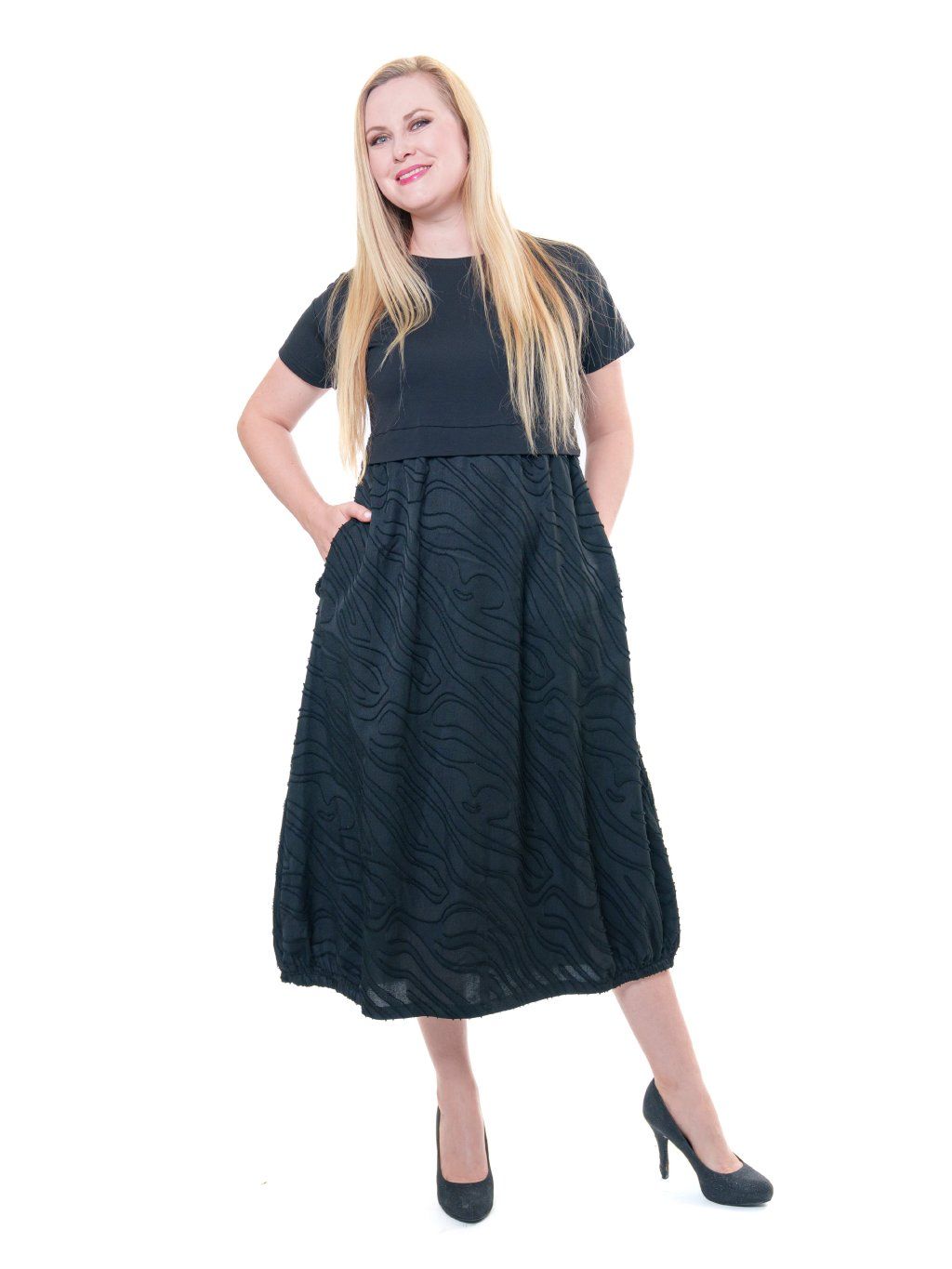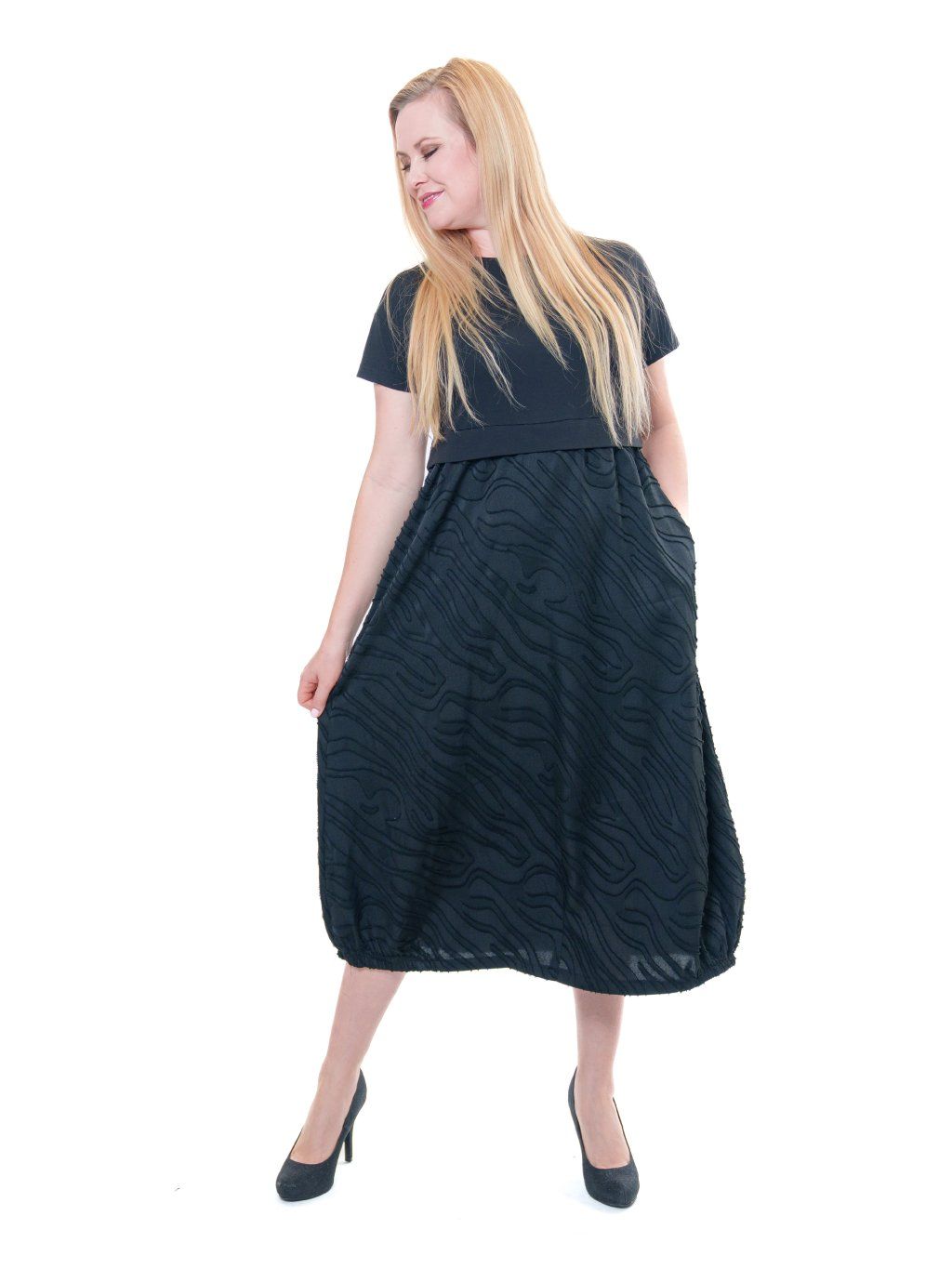 Vyzkoušený skvěle padnoucí ležérní střih šatů - pohodlný, neformální, uvolněný. Vrchní díl je z elastického úpletu, sukně balonového typu z jemné tkaniny s řezaným vzorováním vytvářející 3D efekt. Střih vhodný i na postavy se širšími boky.