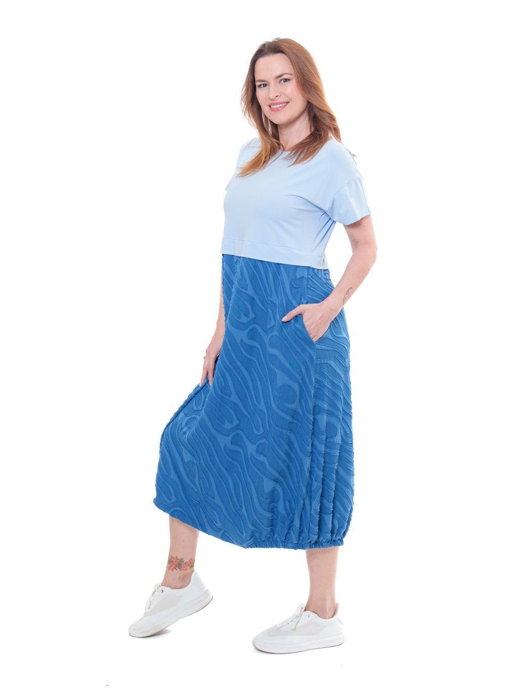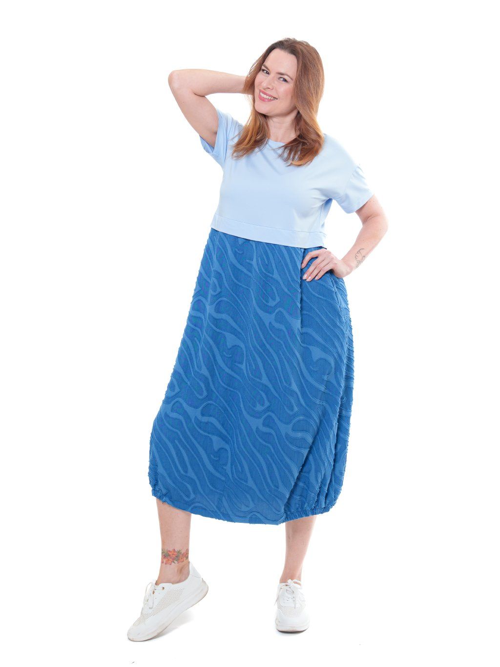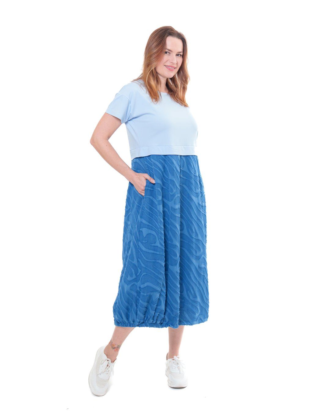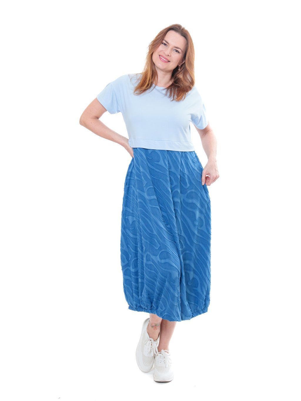 Vyzkoušený skvěle padnoucí ležérní střih šatů - pohodlný, neformální, uvolněný. Vrchní díl je z elastického úpletu, sukně balonového typu z jemné tkaniny s řezaným vzorováním vytvářející 3D efekt. Střih vhodný i na postavy se širšími boky.