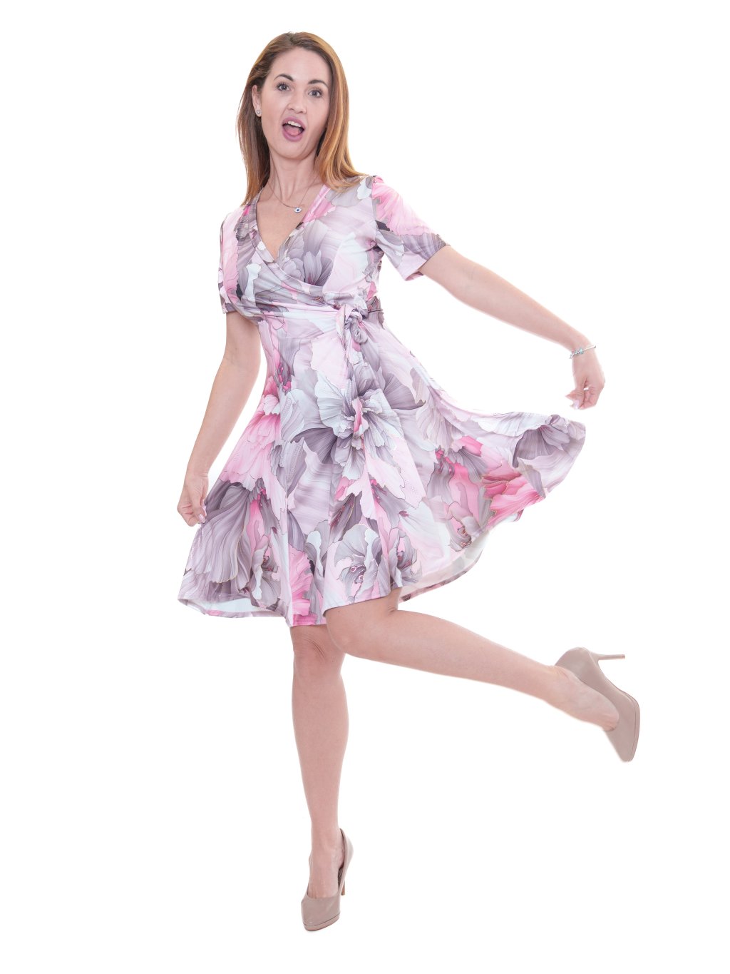 Jednobarevné šaty s přeloženým výstřihem, jemným řasením a vázačkou, s rozšiřenou sukní splývající přes boky. Materiál je příjemně pružný jemný úplet, splývavý.