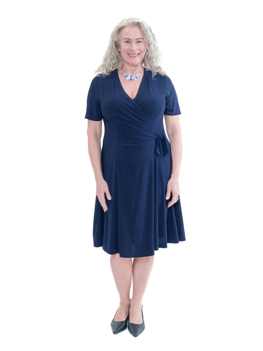 Jednobarevné šaty s přeloženým výstřihem, jemným řasením a vázačkou, s rozšiřenou sukní splývající přes boky. Materiál je příjemně pružný jemný úplet, splývavý.