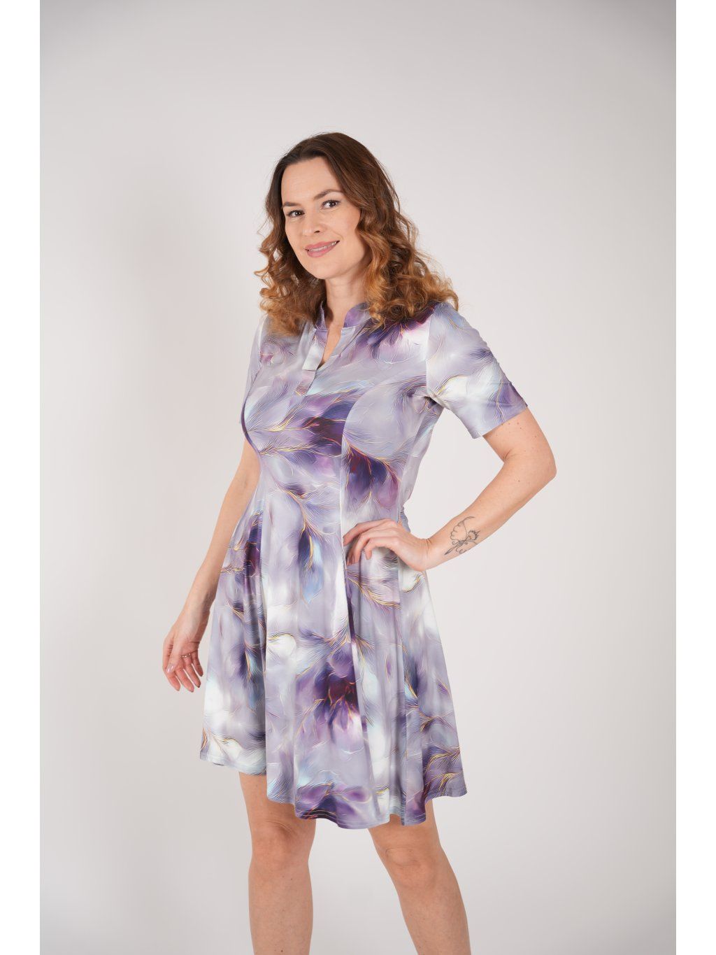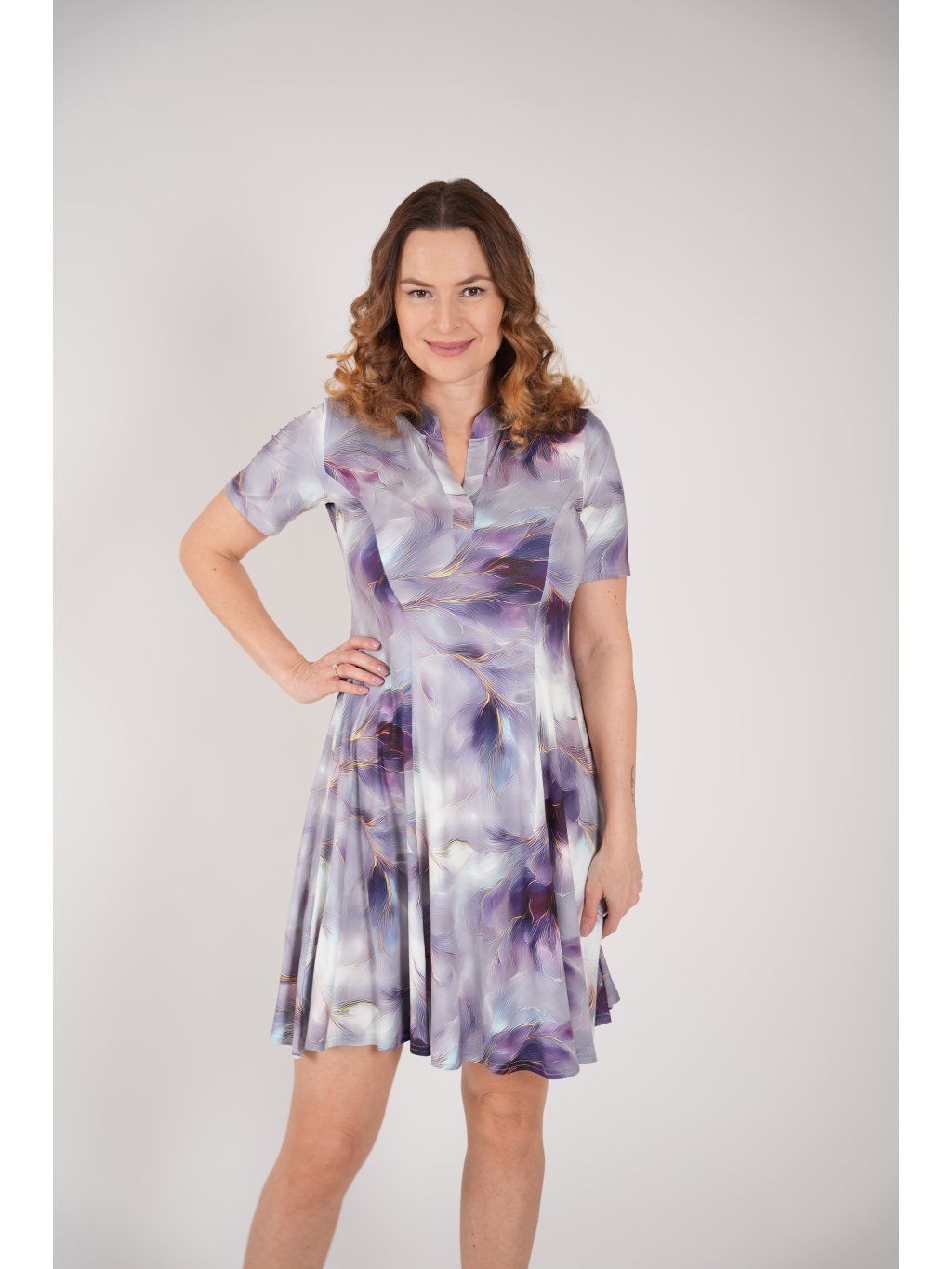 Letní šaty princesového střihu s rozšířenou sukní z jemného splývavého úpletu s elastanem. Tento střih s rozhalenkou a stojáčkem dodává šatům sportovnější střih a zároveň zvýrazňuje ženské křivky.