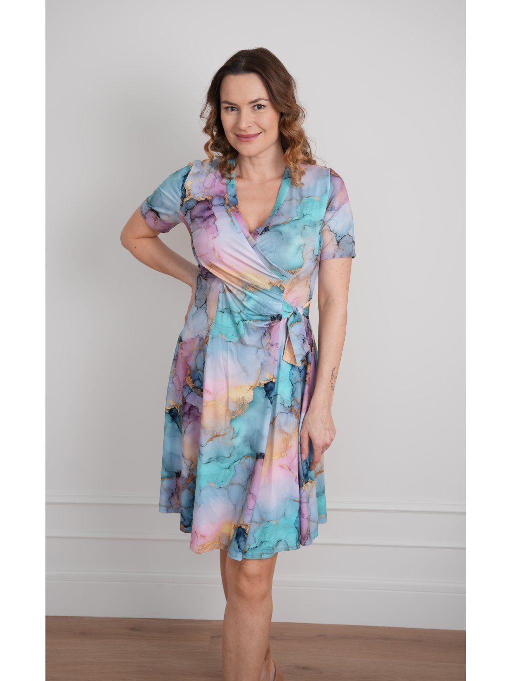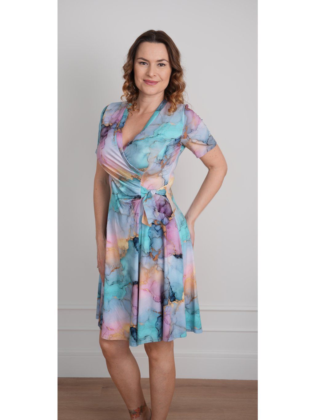 Úpletové šaty s digitiskem s přeloženým výstřihem, jemným řasení přes pas s vázačkou, s rozšířenou sukní splývající přes boky. Materiál je příjemný splývavý viskózový úplet.