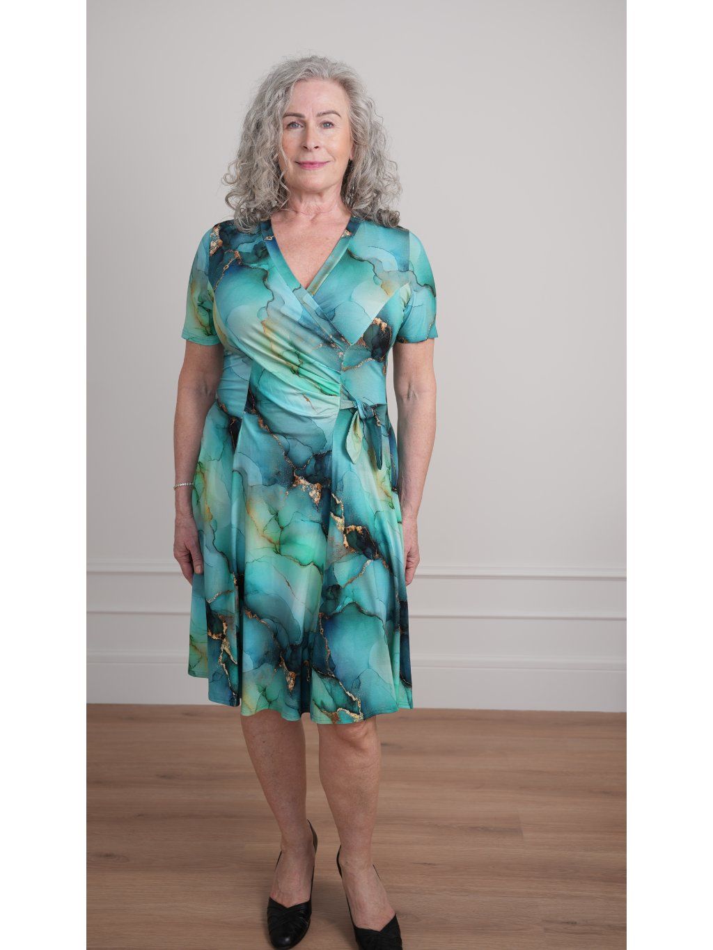 Úpletové šaty s digitiskem s přeloženým výstřihem, jemným řasení přes pas s vázačkou, s rozšířenou sukní splývající přes boky. Materiál je příjemný splývavý viskózový úplet.