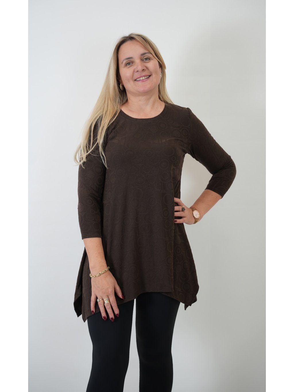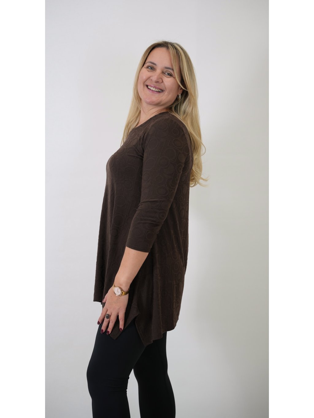 Tunika je vyrobená z jemného úpletu s příměsí elastanu. Elegantní jemné žakárové vzorování lesk/mat. Velmi dobře padnoucí střih postavám se širšími boky, od jsou je tunika mírně rozšířená a splývavá přes bříško a boky.