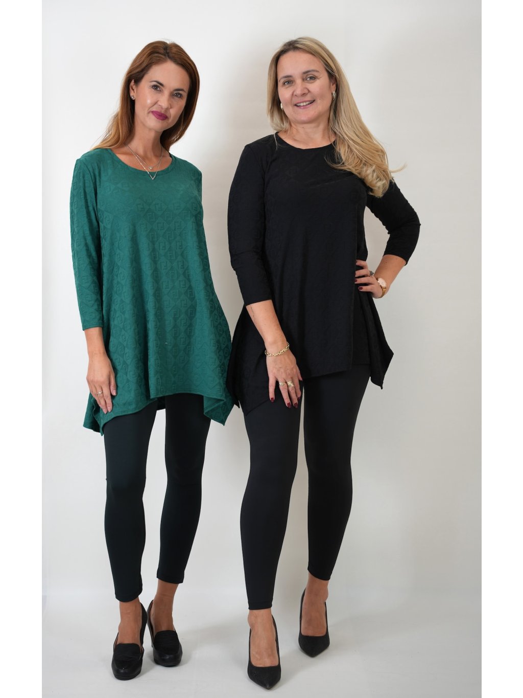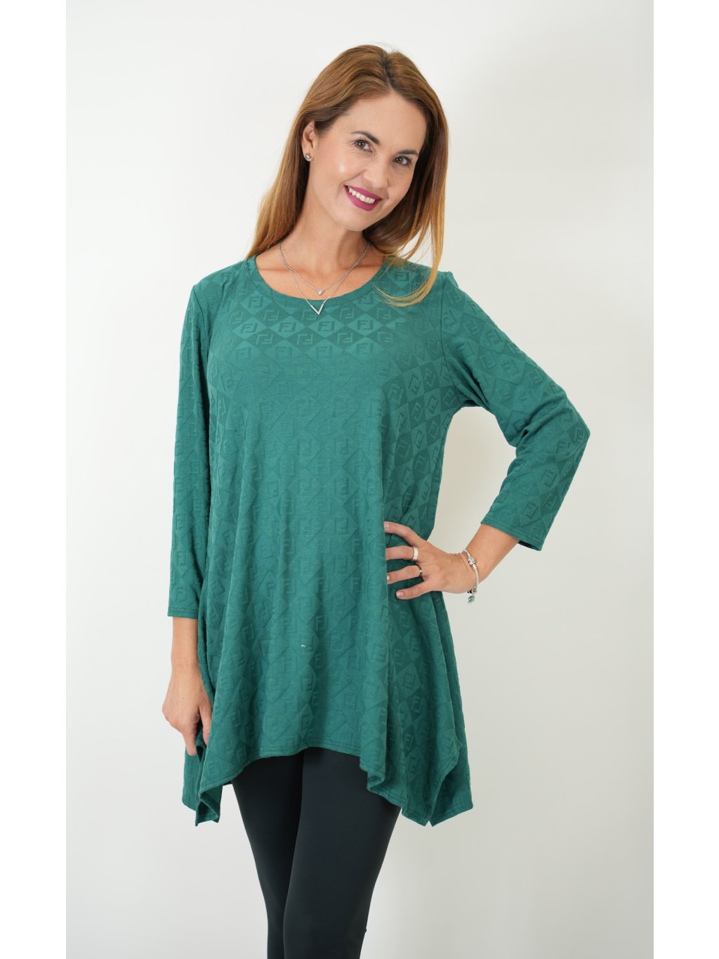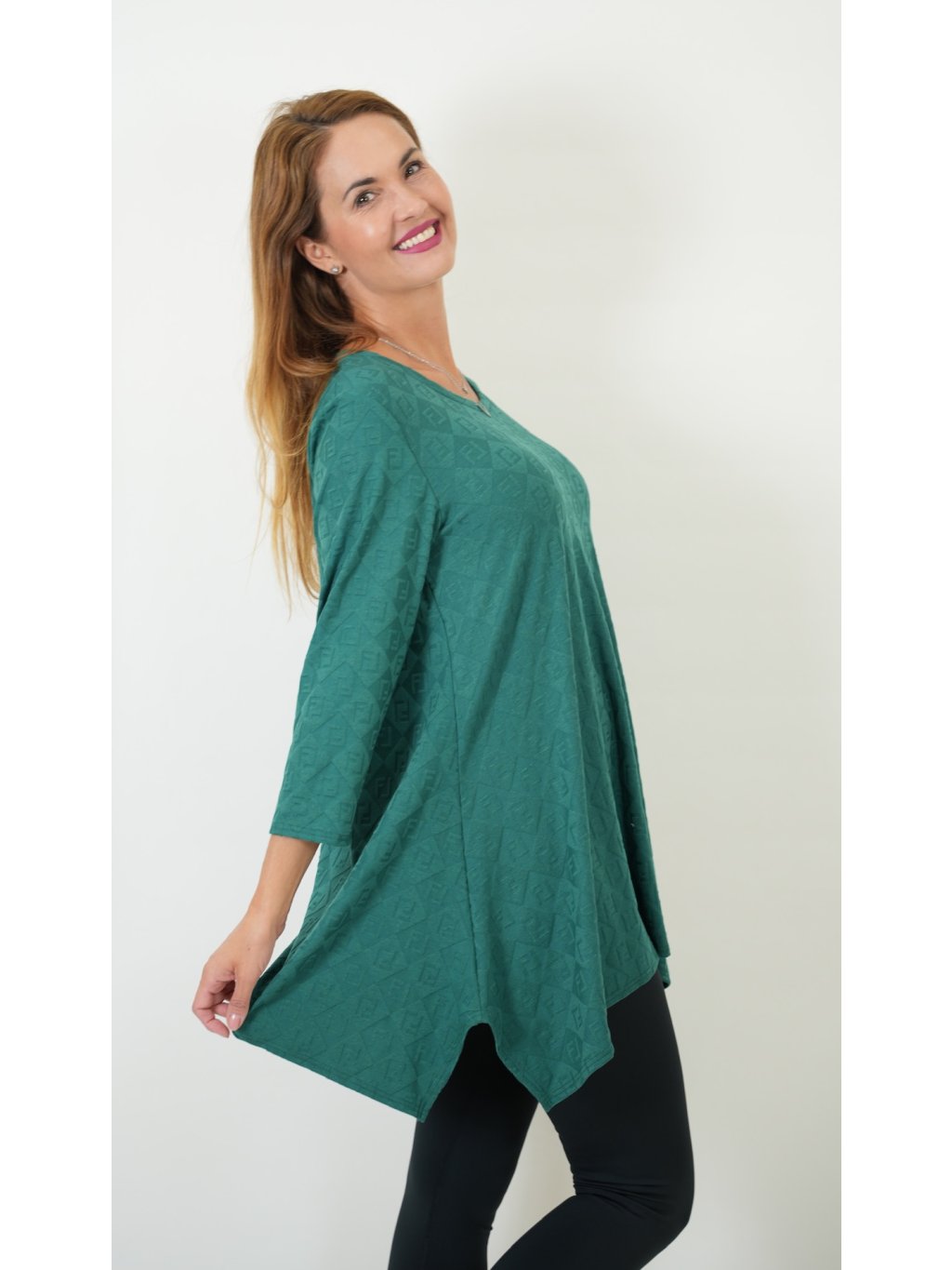 Tunika je vyrobená z jemného úpletu s příměsí elastanu. Elegantní jemné žakárové vzorování lesk/mat. Velmi dobře padnoucí střih postavám se širšími boky, od jsou je tunika mírně rozšířená a splývavá přes bříško a boky.