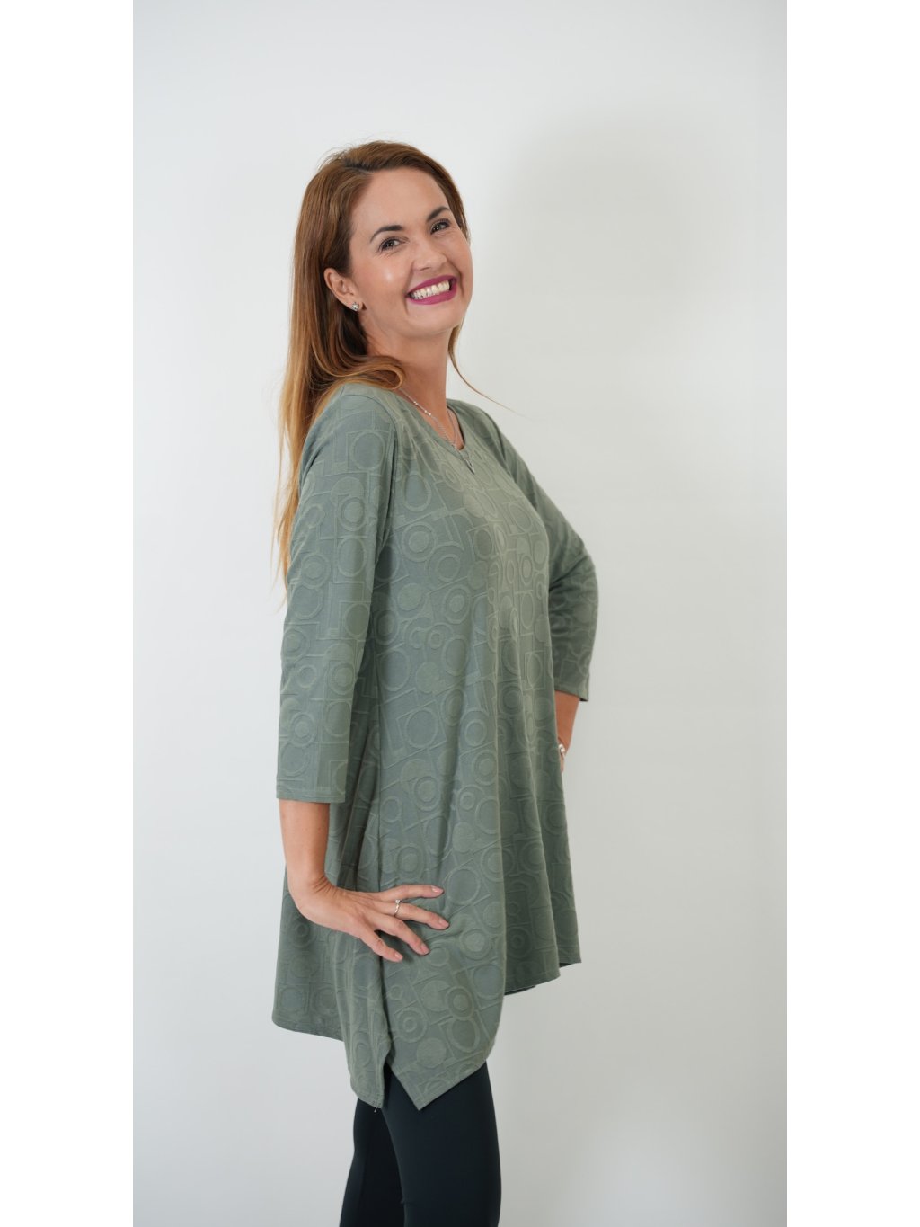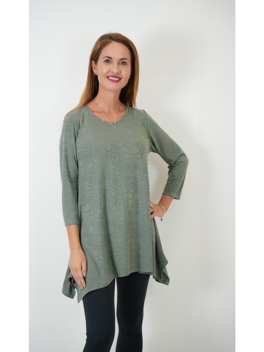Tunika je vyrobená z jemného úpletu s příměsí elastanu. Elegantní jemné žakárové vzorování lesk/mat. Velmi dobře padnoucí střih postavám se širšími boky, od jsou je tunika mírně rozšířená a splývavá přes bříško a boky.